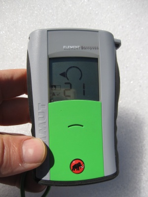 Test de distance : le Pulse (en mode normal, c'est-à-dire numérique) et l’Element commencent à localiser la victime à partir de 50m (arva victime en surface), le signal est perdu périodiquement entre 50m et 40m. En dessous de 40m, pas de perte de signal, les deux DVA donnent des informations consistantes. Les distances affichées sont toujours un peu supérieures à la réalité (distance mesurée avec un mètre ruban), et l’écart d’autant plus grand que l’on se trouve loin de la victime, entre 40 et 50m cet écart peut être de 10m. Le DVA recherché était en surface ; s’il est enfoui, cette distance maximum de détection va se raccourcir. À noter que la préconisation est de 25m (donc 50m au max pour la largeur de la bande de recherche initiale).