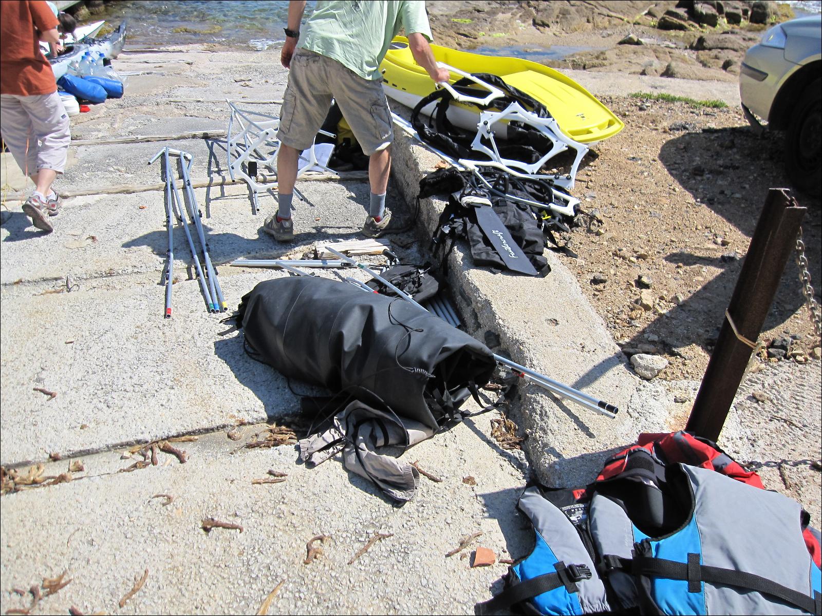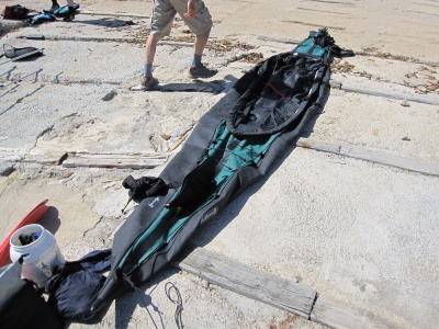 L’armature du kayak est en tube alu de qualité, pas de problème de corrosion. Le montage demande un peu de pratique mais peut être réalisé seul (une heure environ avec l’habitude). Il y a des codes couleurs pour faciliter la manœuvre. Le Klondike est muni de deux boudins latéraux gonflables. Son volume est important et l’on peut y stocker pas mal de choses (mais le matériel pour 3 personnes prend de la place et un peu plus de volume serait plus confortable dans cette configuration). 2 trappes permettent de faciliter l’accès au volume de stockage. L’étanchéité est réalisée par une sorte de cheminée qui se roule. Un capot en tissu étanche se fixe au-dessus de la cheminée pour parfaire la fermeture. Le tube du faîte du kayak barre les trappes, c’est dommage.