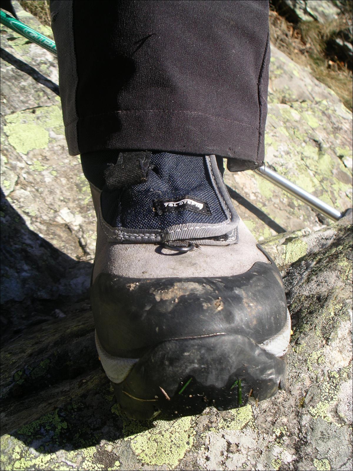 La chaussure est bien protégée sur l’avant par une bande de caoutchouc qui revient sur le dessus des orteils et qui permet de protéger correctement la chaussures de la croûte de regel lorsque la chaussure se trouve en appui final.