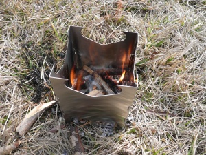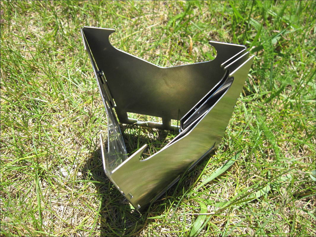 Note : Nous avons reçu une nouvelle version du réchaud, il s’agit du MG-NG (Magic Flamme Next Generation). Il est identique en tout point à la version précédente en dehors du fait que la nouvelle version est percée de multiples petits trous sur les cloisons. Il est livrée avec de petites pattes qui se glissent dans ces trous. Le but est d’en faire un support pour réchaud à alcool type Trangia (mais on peut aussi mettre des bougies ou des pastilles d’alcool gélifié, ou un P3RS). Le réchaud fera alors un pare-vent pour le réchaud à alcool et support à popote. L’intérêt est donc d’augmenter la polyvalence et de pouvoir utiliser le réchaud aussi dans les zones où le feu de bois est interdit. La solution à alcool sera nettement plus sûre du point de vue du risque d’incendie.