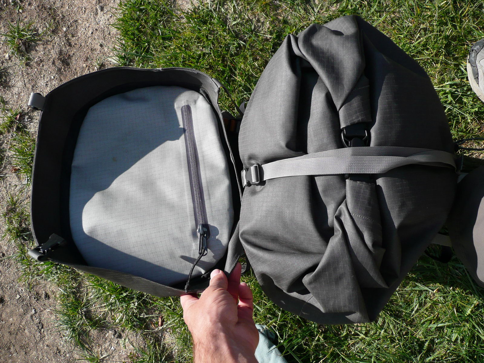 Voilà un des sacs les plus intéressants de ce test, malheureusement avec un prix particulièrement effrayant aussi . Ce tarif peut s’expliquer par le fait que le sac est entièrement fabriqué au Canada, à l’heure où la plupart des fabricants font faire leurs produits en Chine. Ce sac est complètement étanche. Le compartiment principal, à l’instar des sacs étanches traditionnels, est pourvu d’une ouverture qui se roule. Le tissu est très robuste et totalement étanche. L’Acrux n’a que très peu de coutures, les seules présentes sont protégées par une bande thermocollée. Tout le reste est collé. C’est d’ailleurs étrange de voir des pièces aussi sollicitées que les bretelles ou la ceinture connectées au sac par un empiècement collé ! Mais ce sac est parti en Islande pendant plus d’un mois, nous ne l’avons pas du tout ménagé et il n’a pas bronché. Comme le Osprey Aether, il nous a vraiment satisfaits. La poche sommitale contient 2 compartiments à zip étanche ; immergé dans l’eau, le top ne serait pas complètement étanche, mais aucun problème sous une pluie battante. Il existe sur le marché quelques sacs à dos étanches (par exemple chez Ortlieb), mais cela se résume en général à 2 bretelles et une pseudo ceinture sans aucune armature. Le Acrux, lui, est doté d’une vraie structure de portage très convaincante. Le dos est rigidifié par 2 lattes en alu et une plaque de plastique recouverte de mousse. La taille du dos n’est pas réglable et il faut le choisir à la bonne taille. Seul défaut dans la cuirasse : la ceinture qui, si elle est nettement plus élaborée que celles présentes sur les autres sacs à dos étanches du marché, manque encore d’un peu de tenue. Cependant, c’est tout de même l’un des sacs qui a le meilleur portage du test. Avec une ceinture plus large et mieux maintenue, il serait quasiment parfait . Il est orienté alpinisme avec des porte-matériels techniques (2 portes piolets frontaux, 2 sangles de compression latérales (2x2) et pas de poche latérales pour garder une forme étroite). Du très beau matériel d’expédition avec des finitions irréprochables. Cela pourrait être l’avenir du sac à dos (un peu comme les sacoches de vélo qui maintenant sont de plus en plus souvent étanches), et si davantage de fabricants se mettent à proposer ce type de sac, gageons que les prix baisseront.