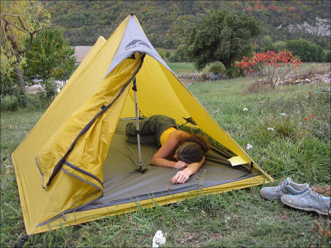 La toile descend bien au ras du sol évitant les courants d’air et les projections d’eau. La tenue au vent est plutôt bonne. Les bâtons de marche étant bien plus résistants que des arceaux traditionnels, la structure résultante est très solide. Nous l’avons laissée montée plusieurs jours par fort vent et pluie : aucun souci.