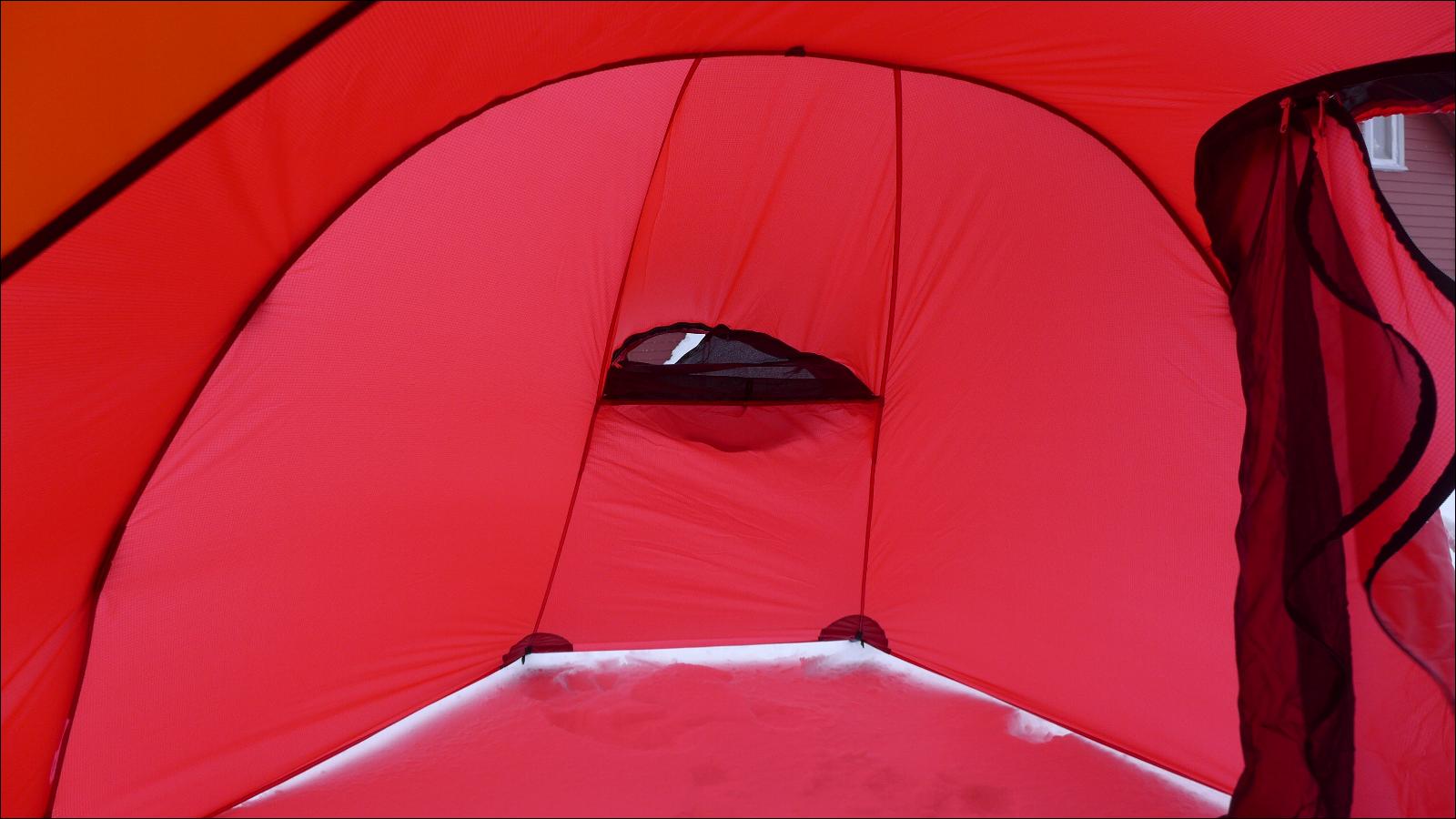 La tente intérieure est de couleur jaune orangée (plutôt lumineuse, donc a priori plutôt agréable – ce qui est moins le cas de l'abside, un peu plus sombre du fait de la couleur rouge du double-toit). Elle s'ouvre complètement à ses 2 extrémités. Ces portes ont des zips double curseur et sont doublées d'une moustiquaire sur les 4/5e de leur surface (également zippées avec double curseur).