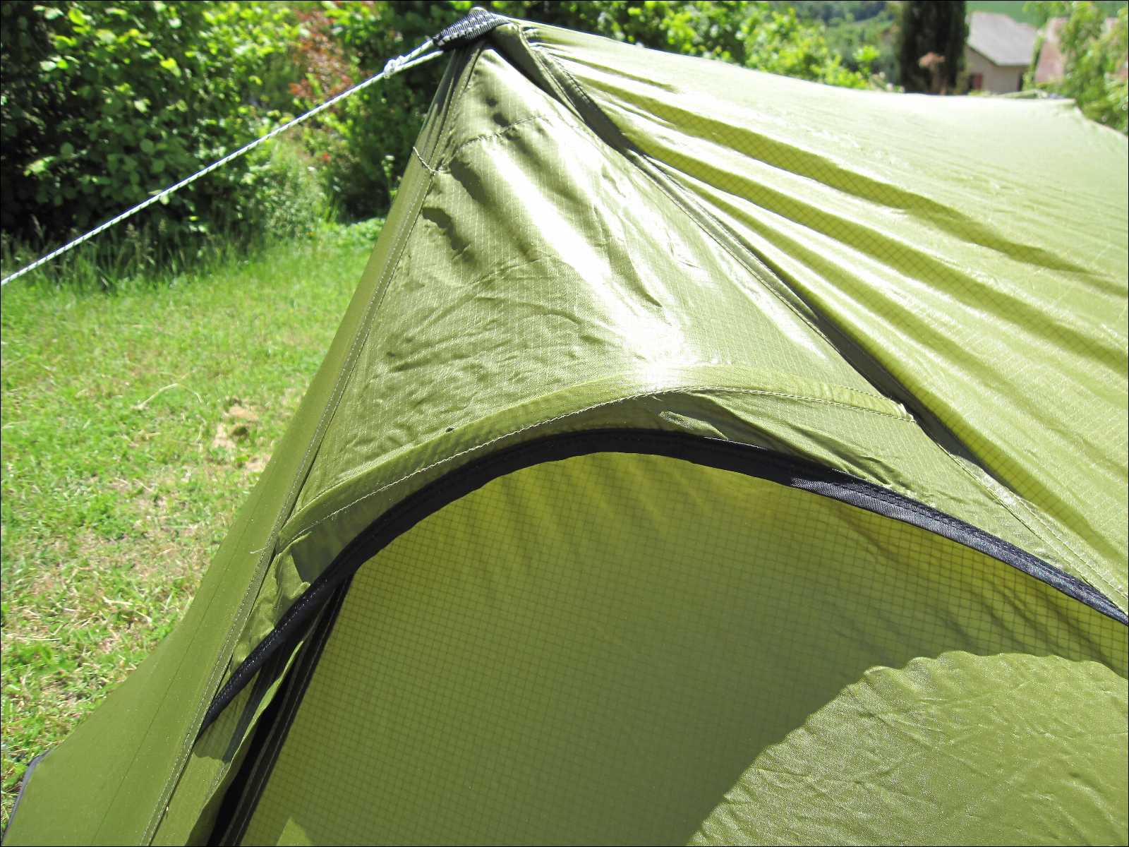 Le hauban du bout de tente (à droite sur la photo) est quasi indispensable pour éviter que le double-toit ne touche la tente intérieure