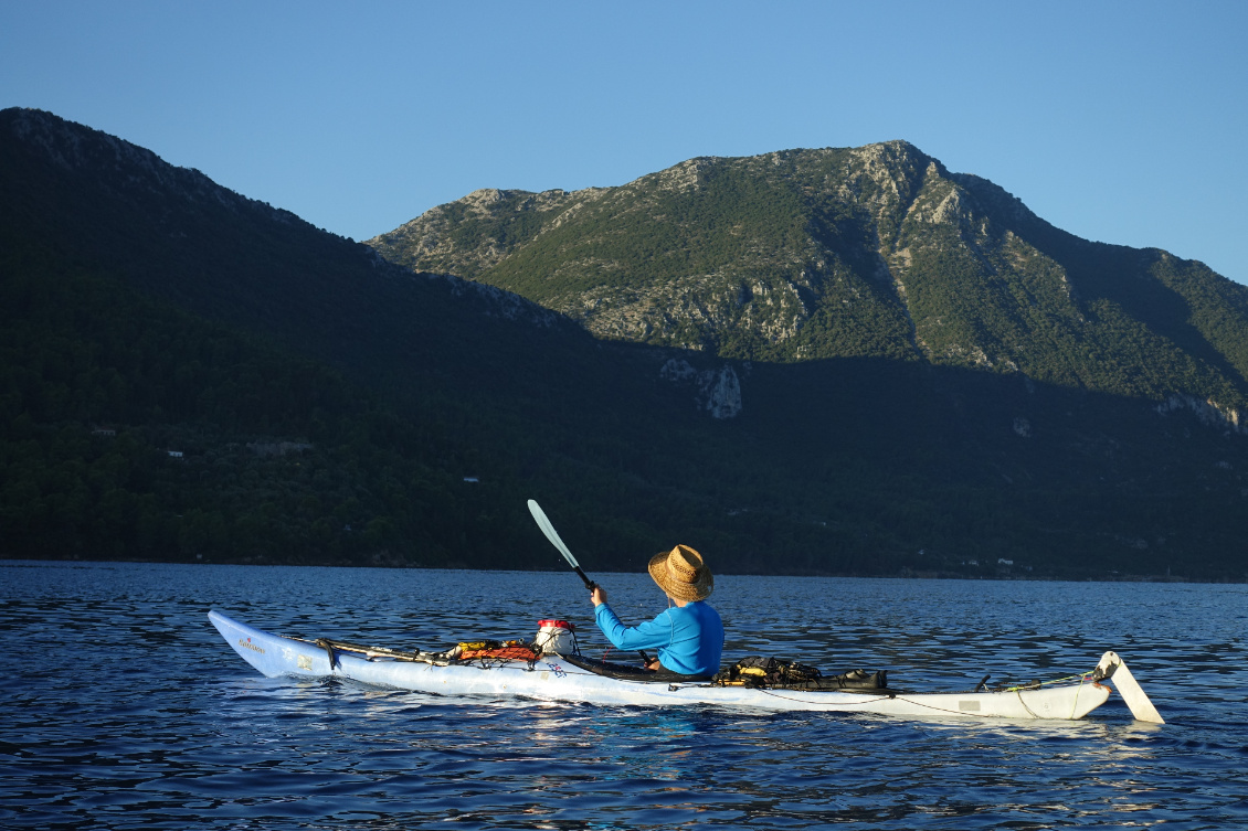 Nous longeons la côte ouest d'Atokos et traversons vers Kastos. On croise un dauphin qui ne vient malheureusement pas jouer dans l'étrave de nos kayaks comme ils le font avec les voiliers et ferrys. Nous repérons un bivouac potentiel avant le village de Kastos, mais il n'est pas terrible, alors nous achetons de l’eau et quelques provisions à l'épicerie du village, pique-niquons et décidons de pousser jusqu’à Kalamos vu que les conditions de vent sont bonnes avant la perturbation annoncée dans la nuit. Joli bivouac, spacieux et sauvage, sur la face ouest de Kalamos entre le port et le premier bivouac. Toujours les chèvres, fidèles au poste, et plein de poissons. Parfait pour attendre la pluie dans la nuit. Nous resterons ici demain pour laisser passer le mauvais temps.