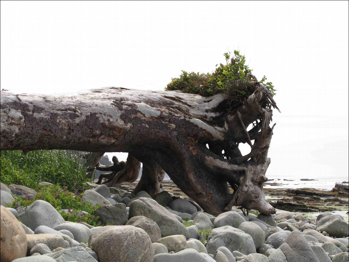 Réveil très tôt ce matin. Il fait un peu gris et nous découvrons au réveil les bateaux des pêcheurs venus devant la rivière pour attraper des saumons. Nous levons le camp rapidement avant 8 h 00 car le programme de la journée est chargé. Nous avons choisi les dates de notre trek en fonction des horaires et de la hauteur des marées, particulièrement pour cette étape. La pointe Owen est un passage incontournable et il serait dommage de passer par la forêt alors que la côte est si attractive.