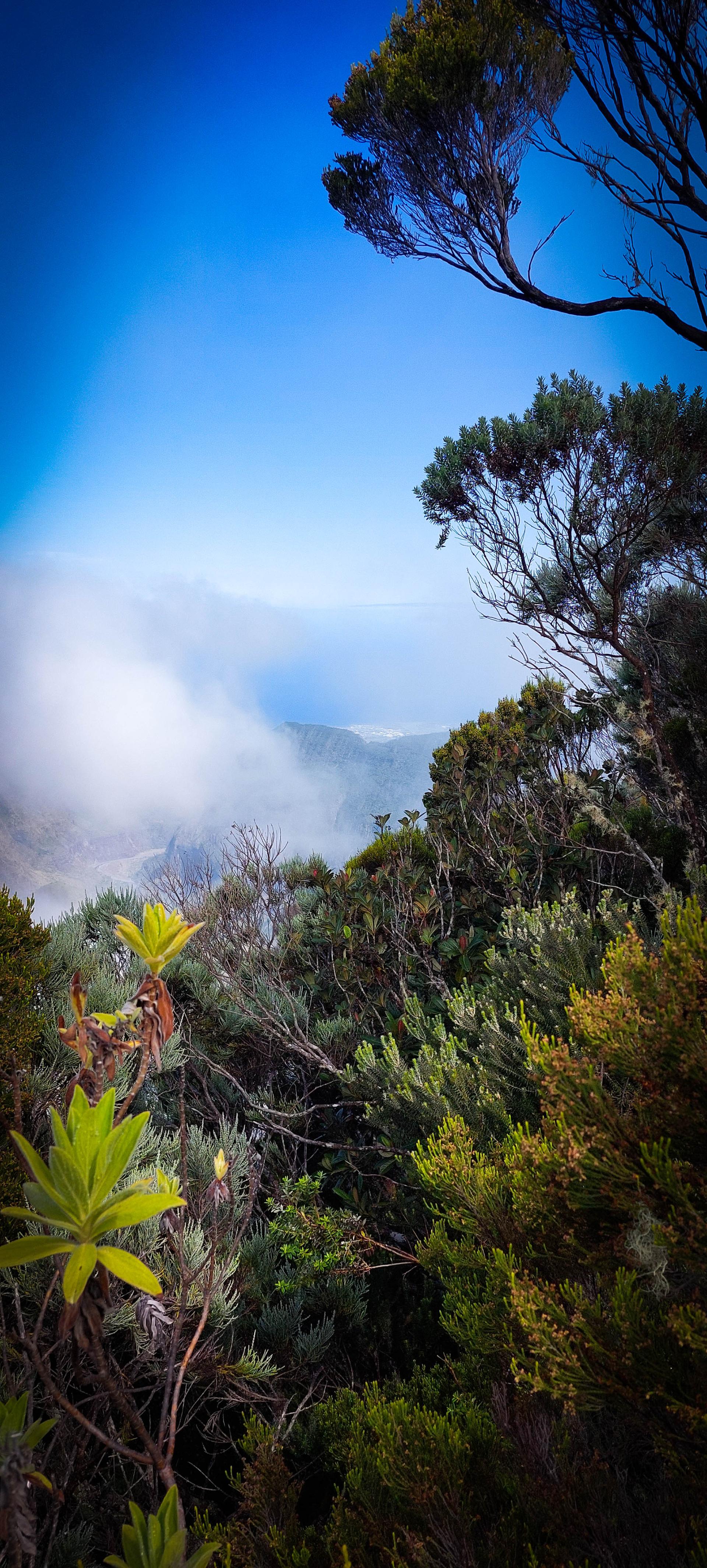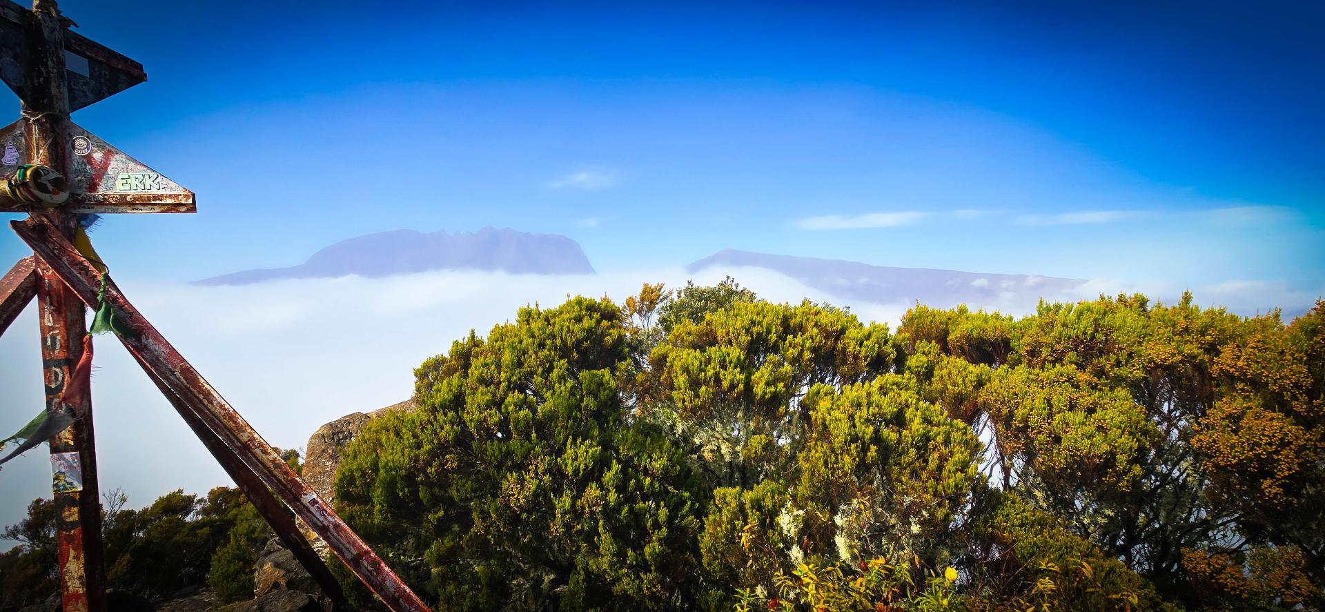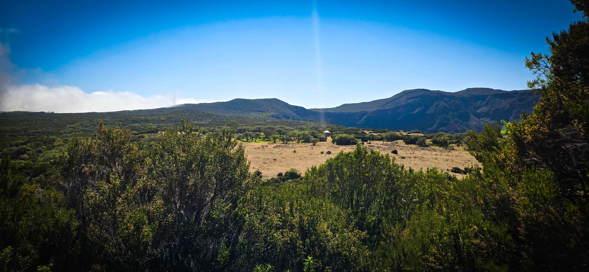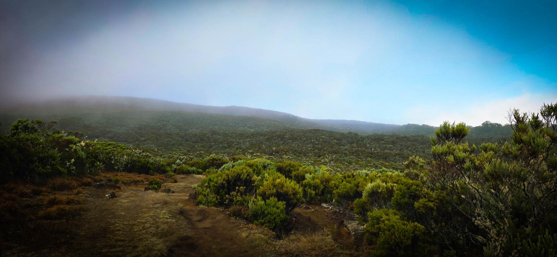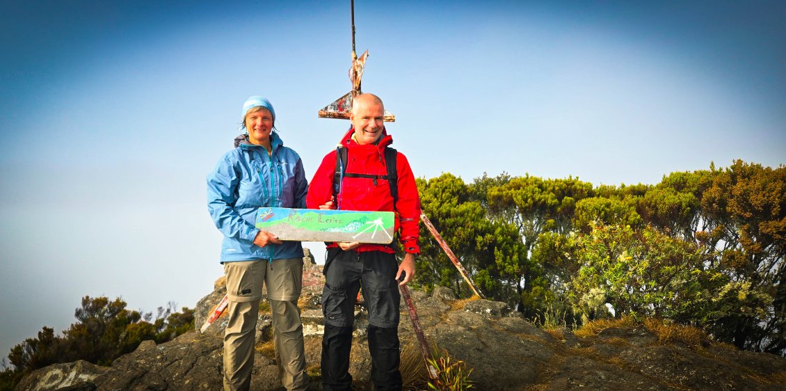 Réveil 6h, petit déjeuner 6h30. Départ sous la bruine à 7h. Nous voici à l'aube de cette deuxième étape. En début de matinée, nous avons prévu de faire la première variante de notre périple: cela consiste à faire un aller-retour au sommet de la Roche Ecrite. La Roche Écrite (2 276 m) est située au nord de La Réunion entre le cirque de Mafate et celui de Salazie. Elle offre un panorama spectaculaire sur ces cirques et l’océan. Site protégé du Parc national, il abrite une flore et faune endémiques. Plusieurs sentiers permettent d’y accéder, de Mamode Camp ou Grand Ilet. Pour nous, ce sera depuis le refuge.