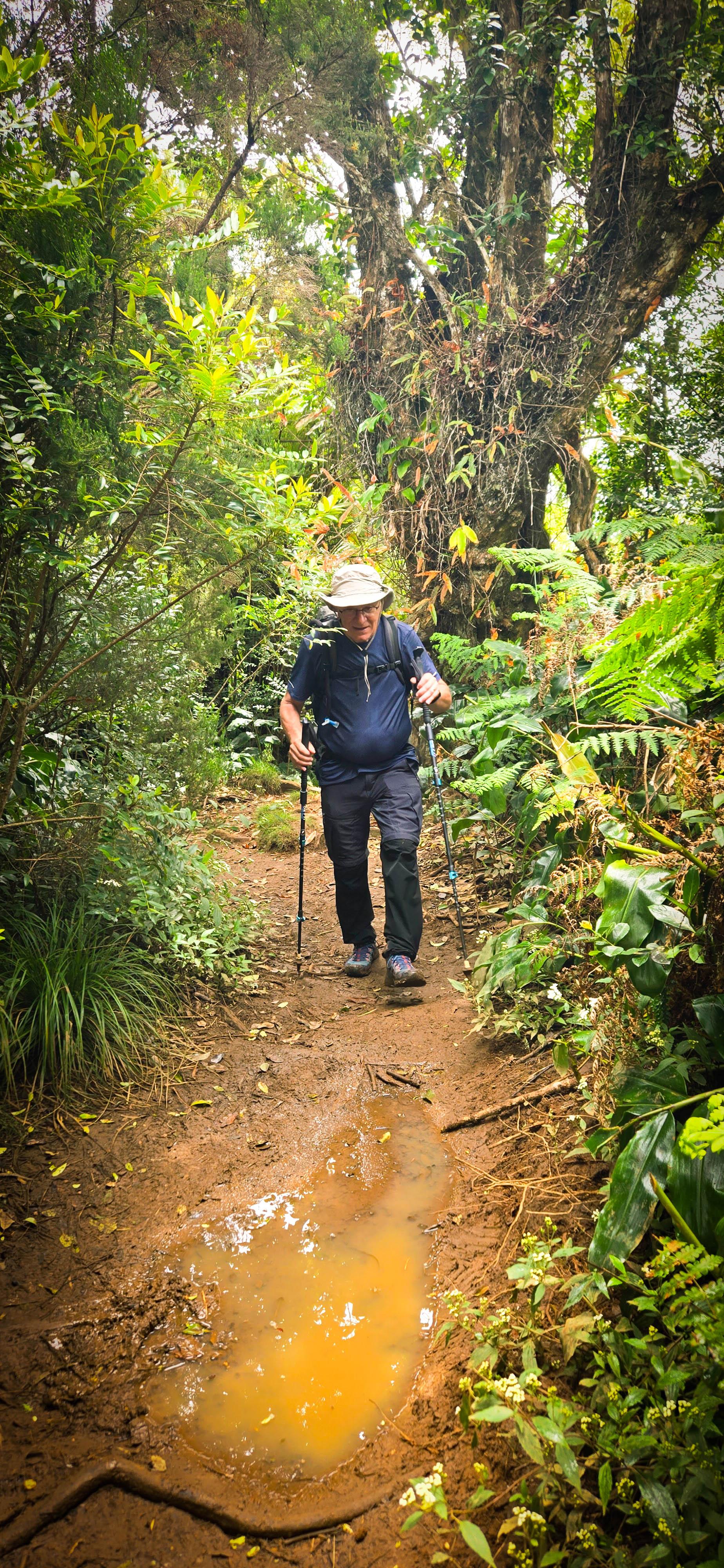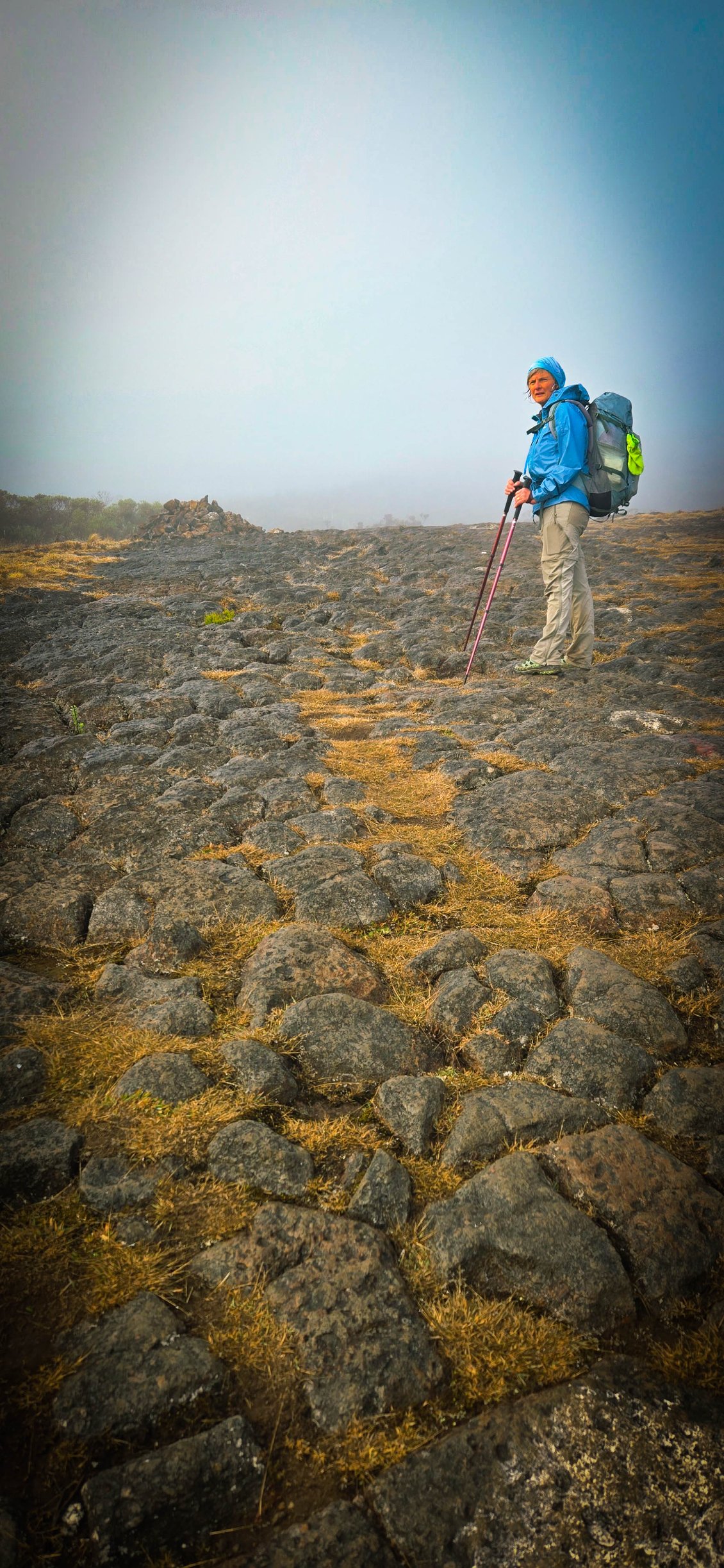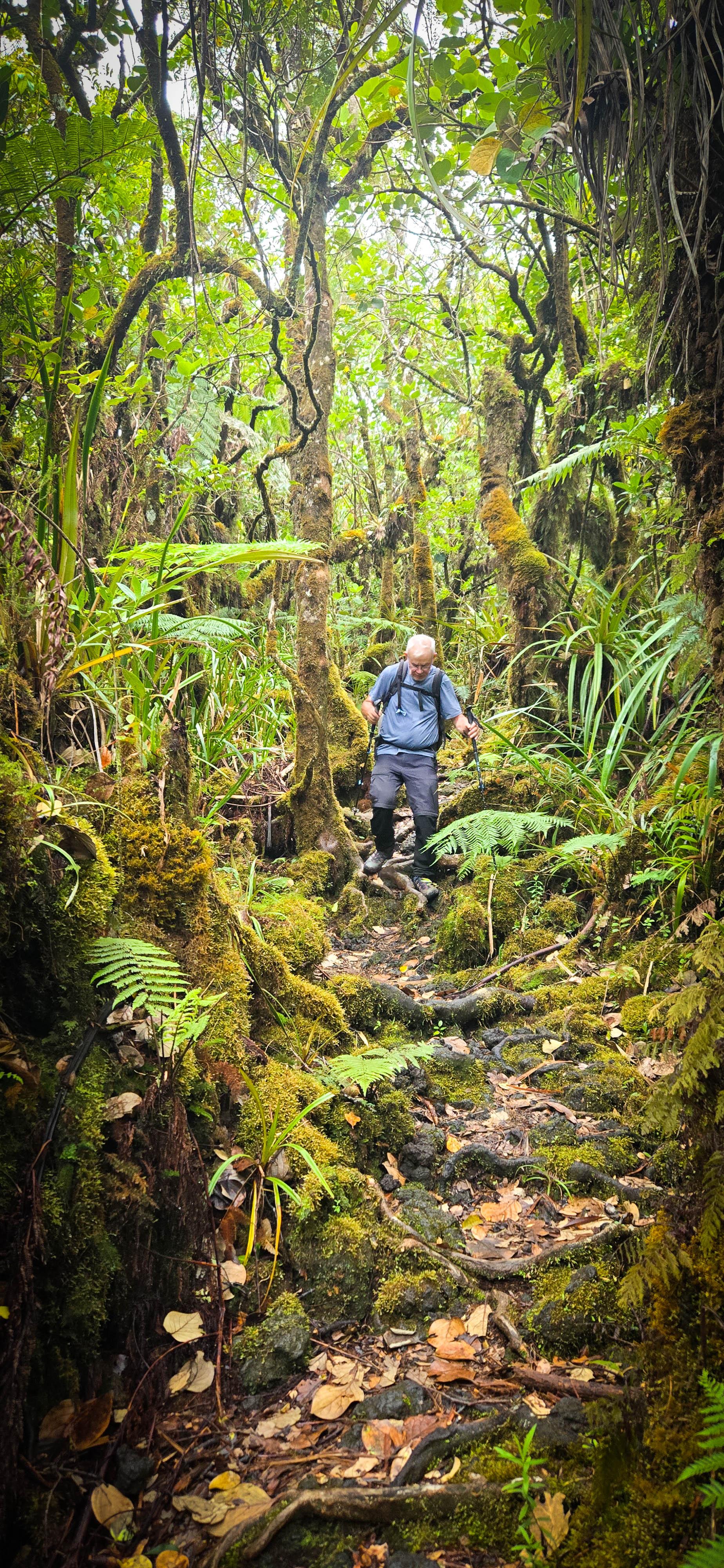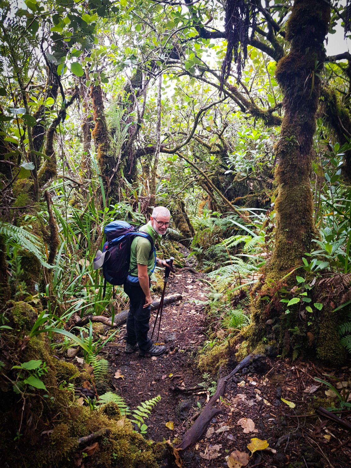 Réveil 6h, petit déjeuner 6h30. Départ sous la bruine à 7h. Nous voici à l'aube de cette deuxième étape. En début de matinée, nous avons prévu de faire la première variante de notre périple: cela consiste à faire un aller-retour au sommet de la Roche Ecrite. La Roche Écrite (2 276 m) est située au nord de La Réunion entre le cirque de Mafate et celui de Salazie. Elle offre un panorama spectaculaire sur ces cirques et l’océan. Site protégé du Parc national, il abrite une flore et faune endémiques. Plusieurs sentiers permettent d’y accéder, de Mamode Camp ou Grand Ilet. Pour nous, ce sera depuis le refuge.