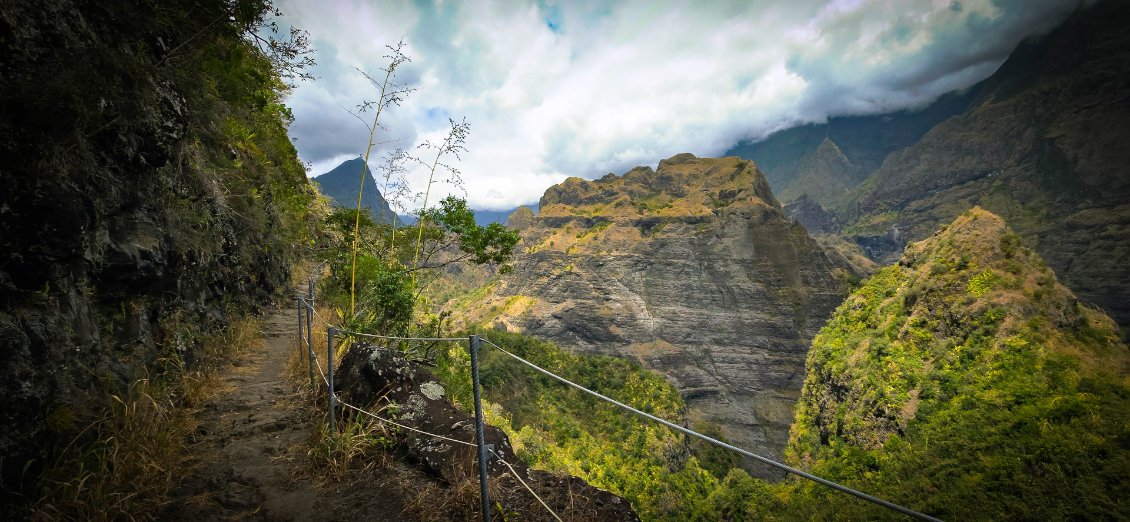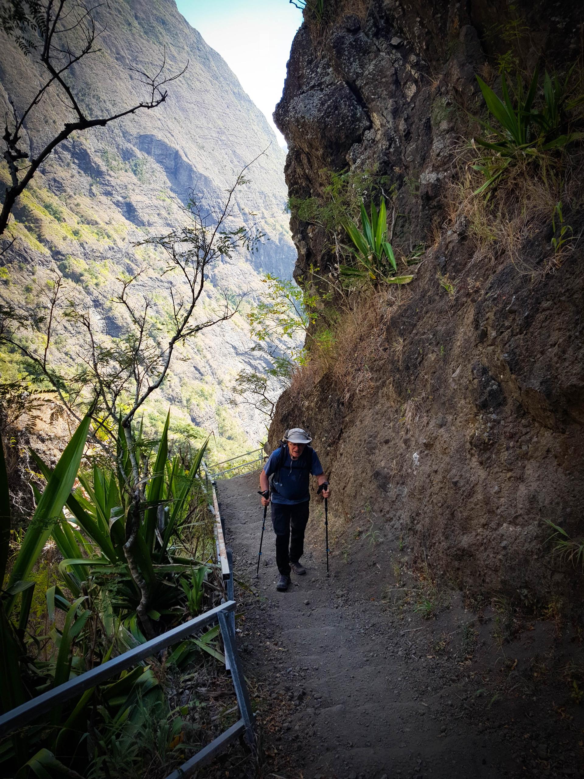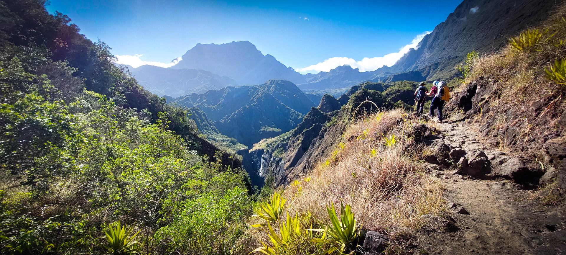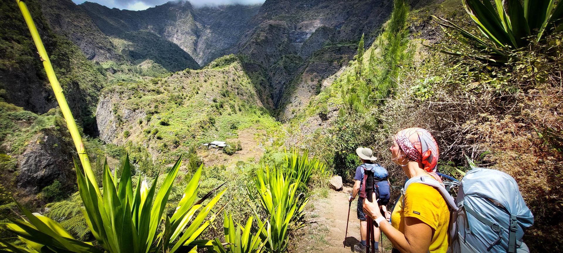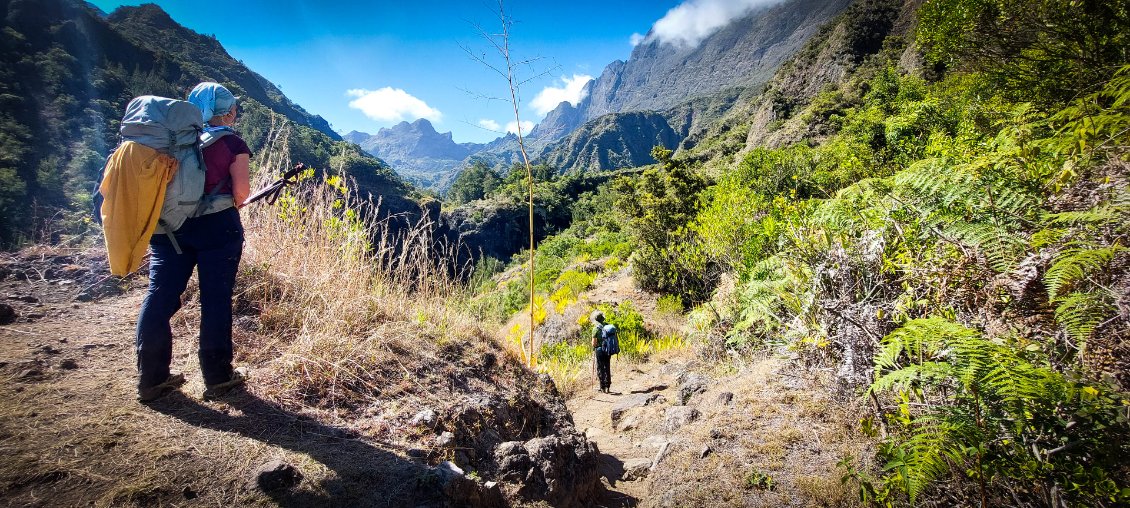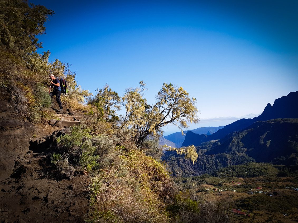 L'étape du jour nous fait quitter cet endroit magnifique qu'est le cirque de Mafate. Dans ce cirque, on aura vraiment vu des choses extraordinaires et, le moins que l’on puisse dire, c’est qu’elles se méritent. Les montées mais également les descentes sont abruptes et éprouvent nos petits corps.