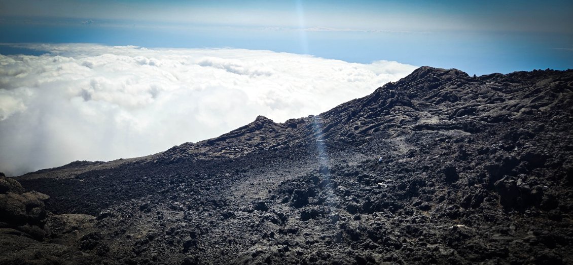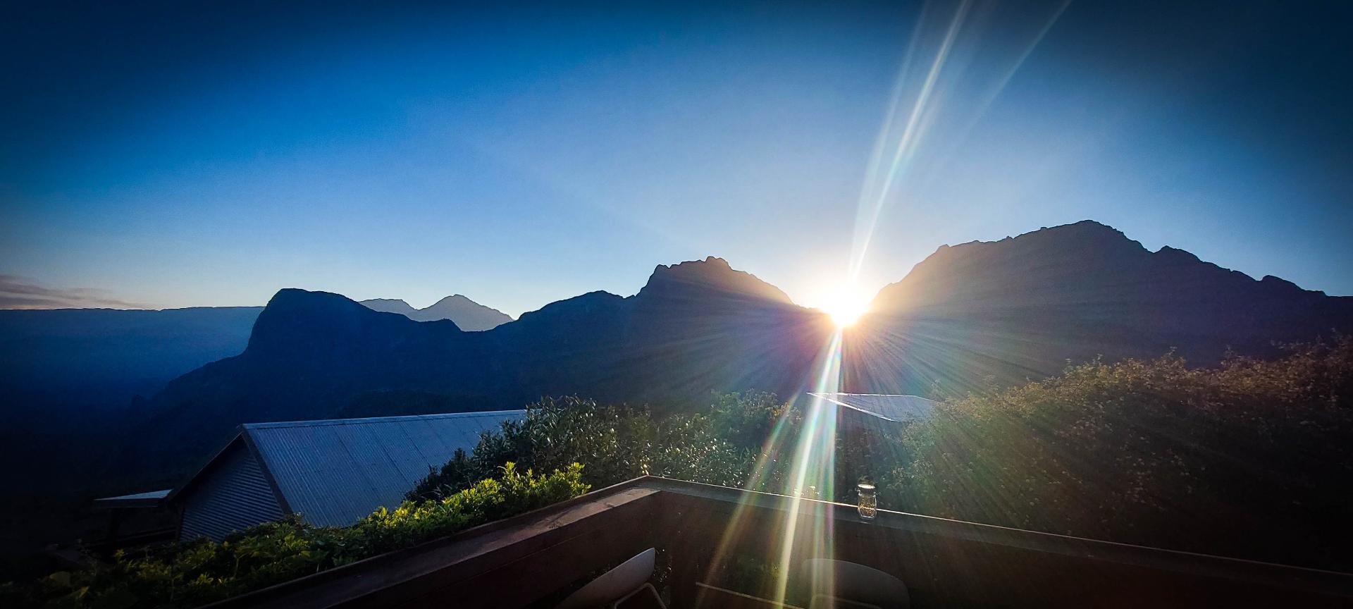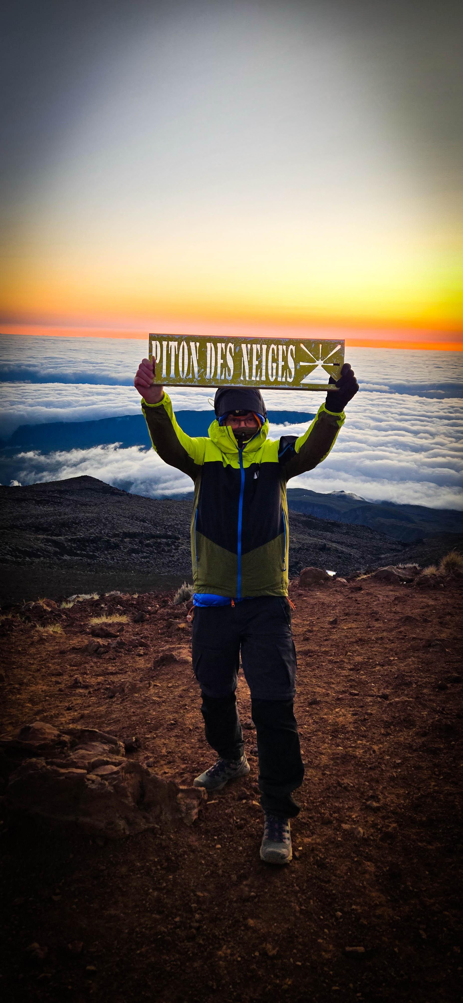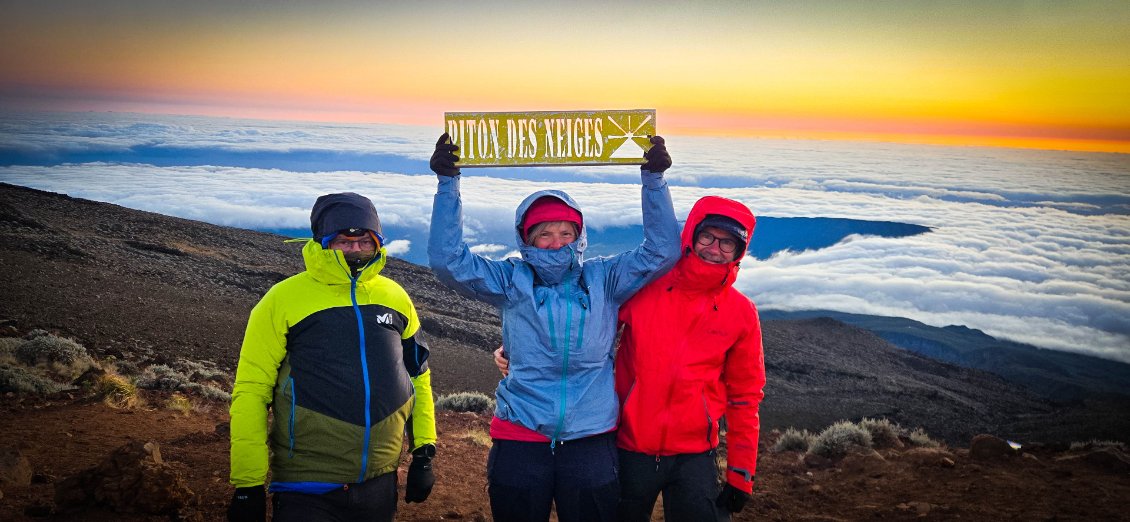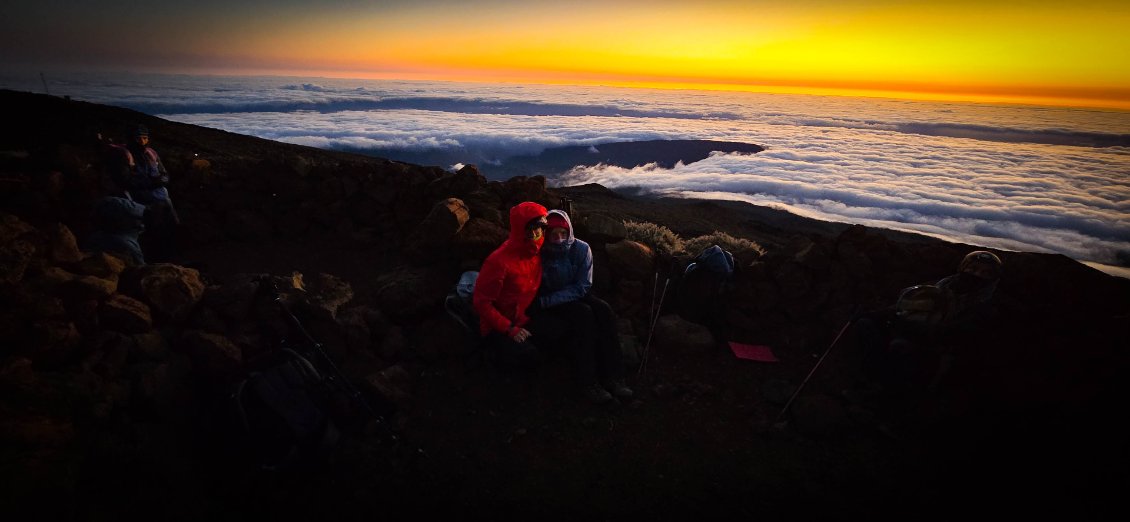 Houla…. La nuit fut courte. Quand le réveil sonne, nous serions bien restés au lit car ce ne fut pas la meilleur nuit. Mais bon, on sait qu’aujourd’hui l'étape est comme qui dirait intéressante et compliquée. Intéressante car on ne met pas un réveil à 3h30 du matin pour rien: on espère un beau levé de soleil au sommet du Piton des neige. Et compliquée car c'est l'étape redoutée de toute notre traversée. Elle va être trèèèès longue. On nous annonce 25km et surtout 1700m de dénivelé négatif.