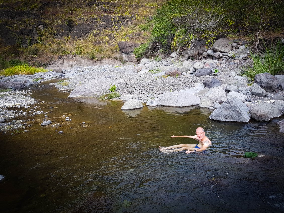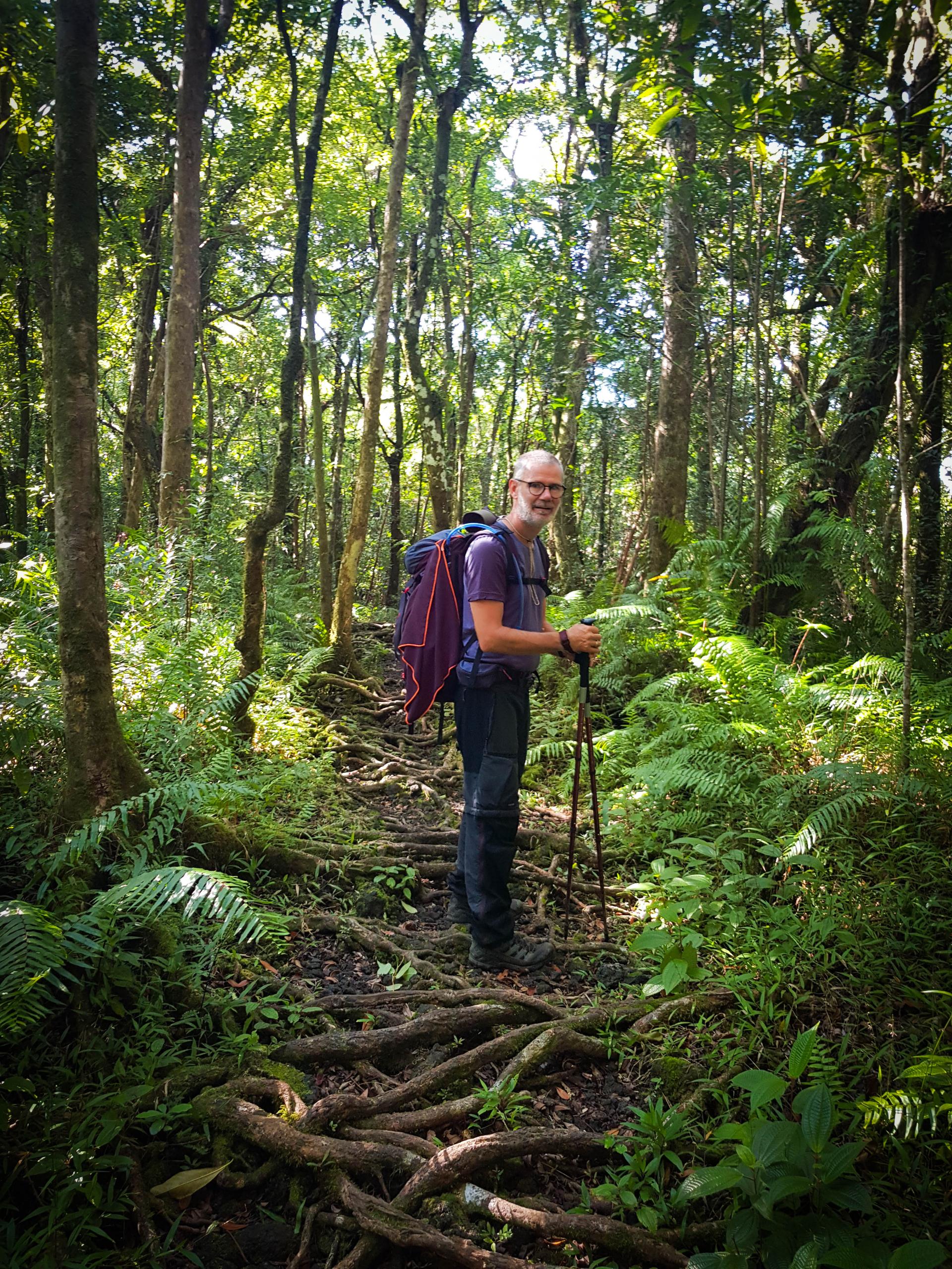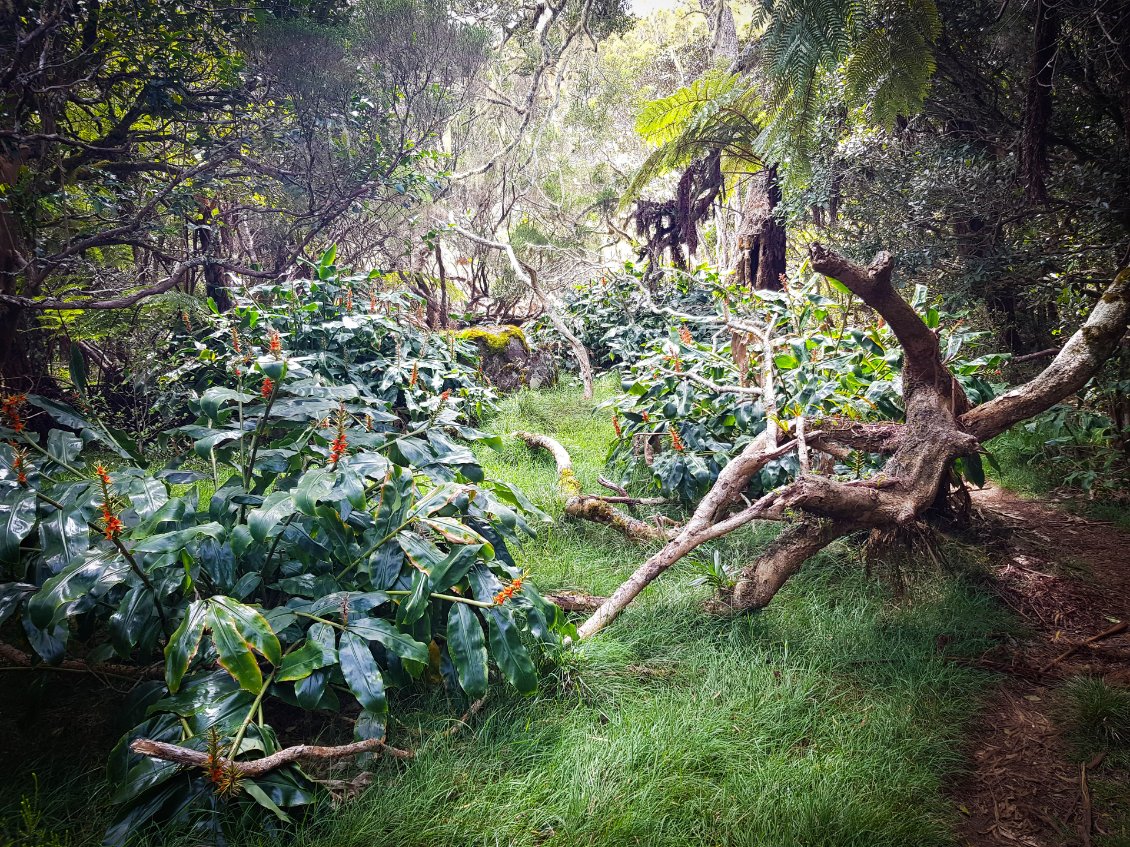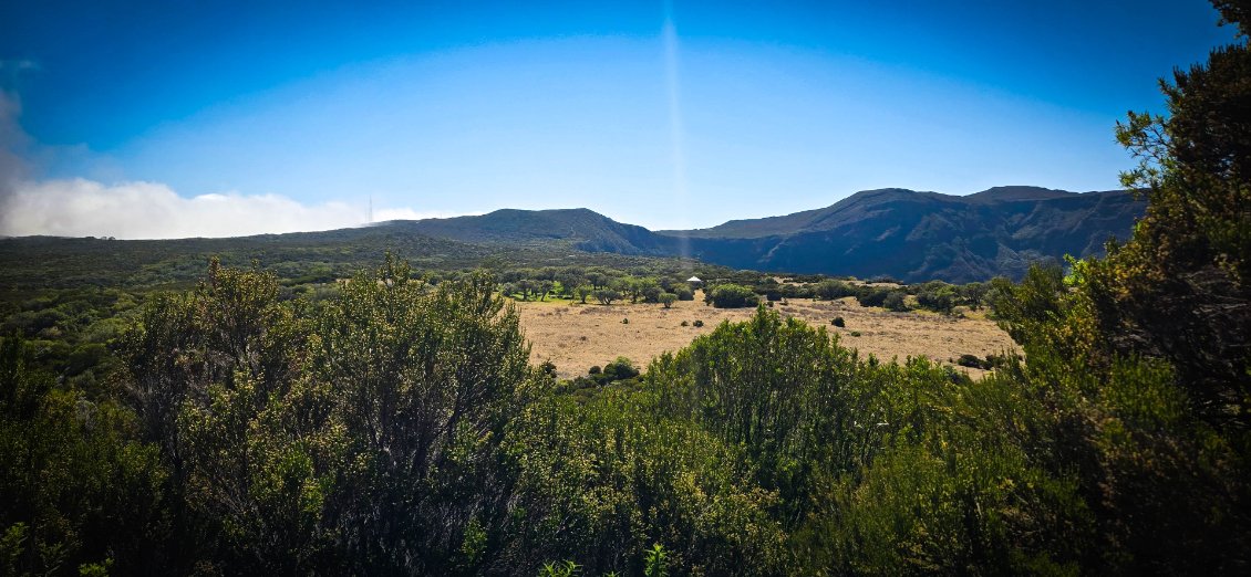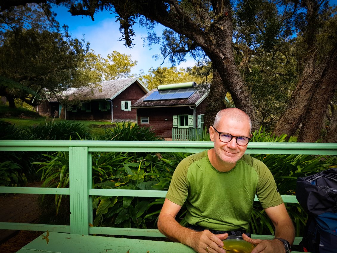 Aujourd'hui, étape de transition: normalement on ne devrait pas trop souffrir. L'étape est courte et le dénivelé peu important. Mais bon, on a appris à rester vigilant. La Réunion réserve souvent des surprises. Départ tranquille à 8h après un petit bon petit déjeuner.