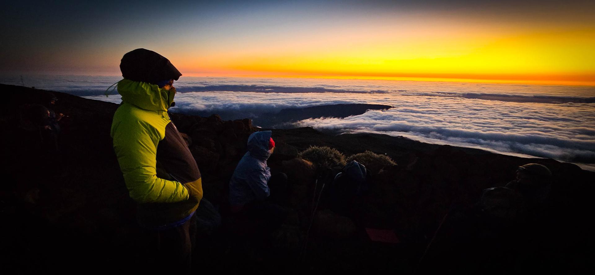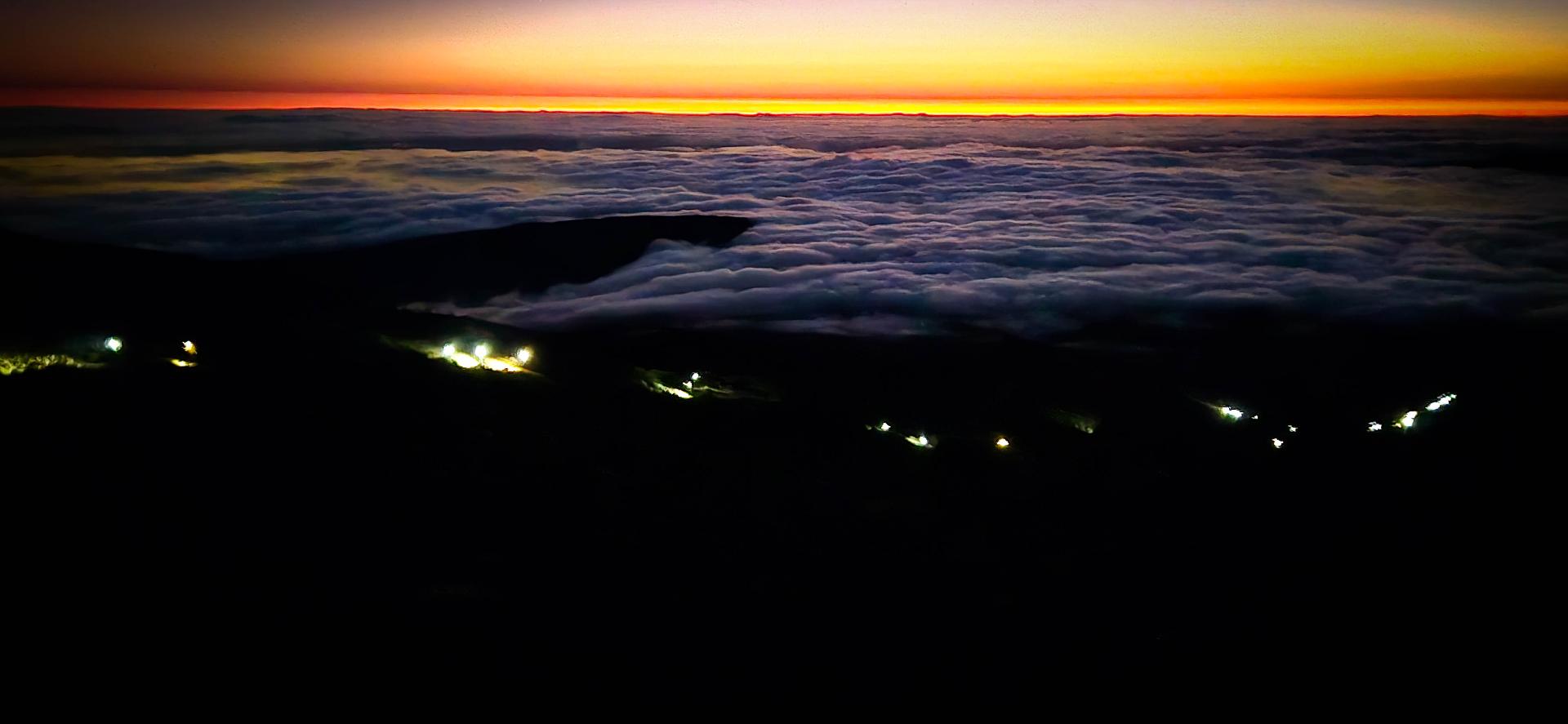 Une longue file indienne depuis le refuge se dessine dessous nous. Ce sont des dizaines de petits points lumineux les uns derrière les autres. Le contraste est magnifique car le jour est en train de se lever, et de jolies couleurs sont en train d'apparaitre.