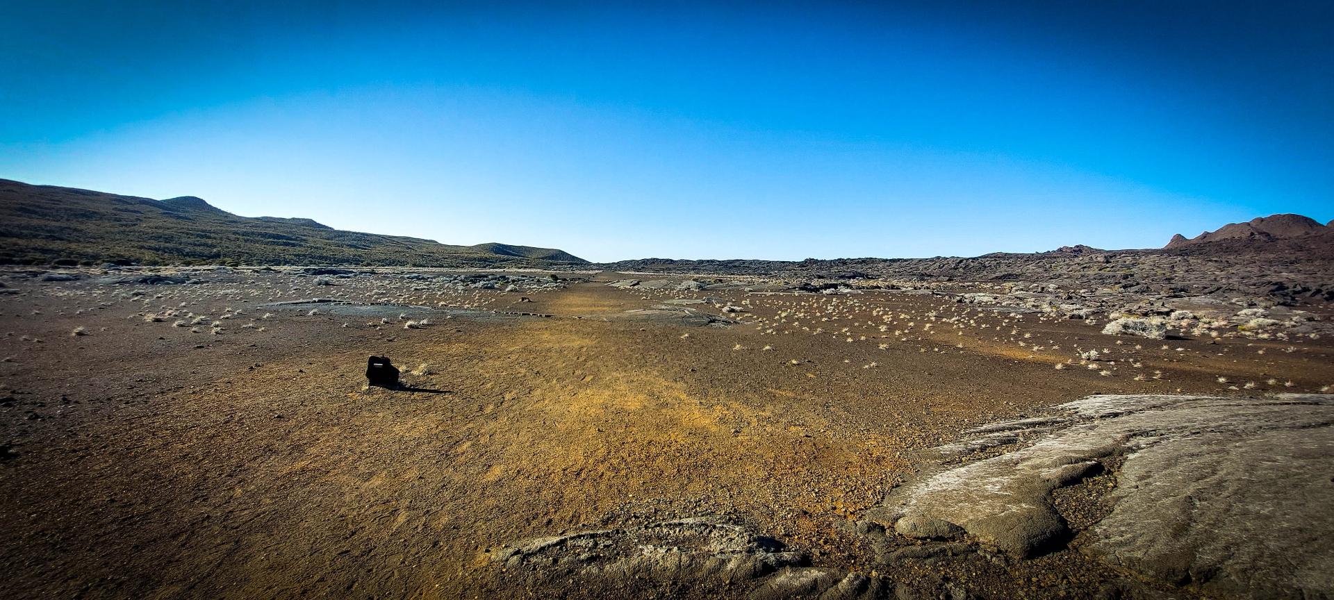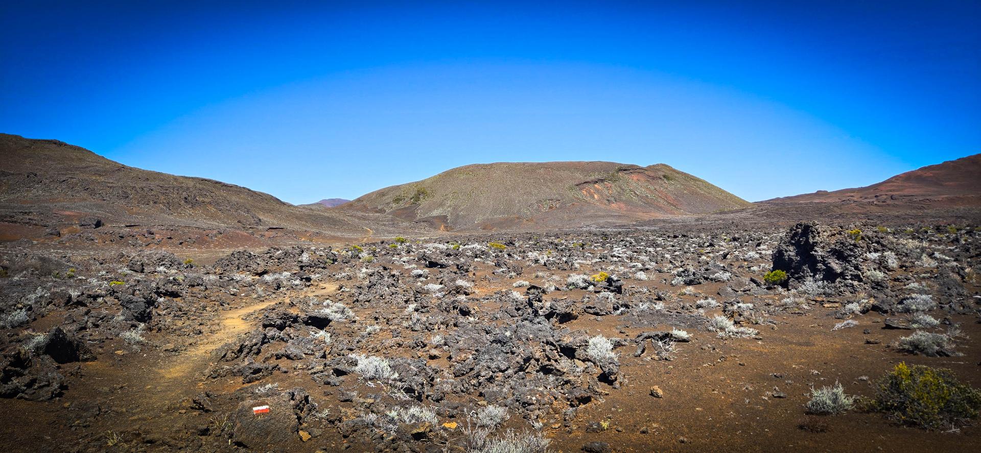 Le début de l'étape est tranquille. Initialement nous avions prévu de rester à proximité des remparts en dehors du tracé du GR R2. Sans infos sur l'état du terrain et vu notre état de fatigue, nous préférons être prudent et nous rejoignons le tracé du GR en empruntant la piste d'accès au gite. Une fois quitté la piste, nous marchons sur un terrain assez facile et roulant fait de scories. Nous avons même droit à l'endroit le plus droit et le plus plat de tout notre périple: y’en a qui disent qu’il n’y a que des marches !!