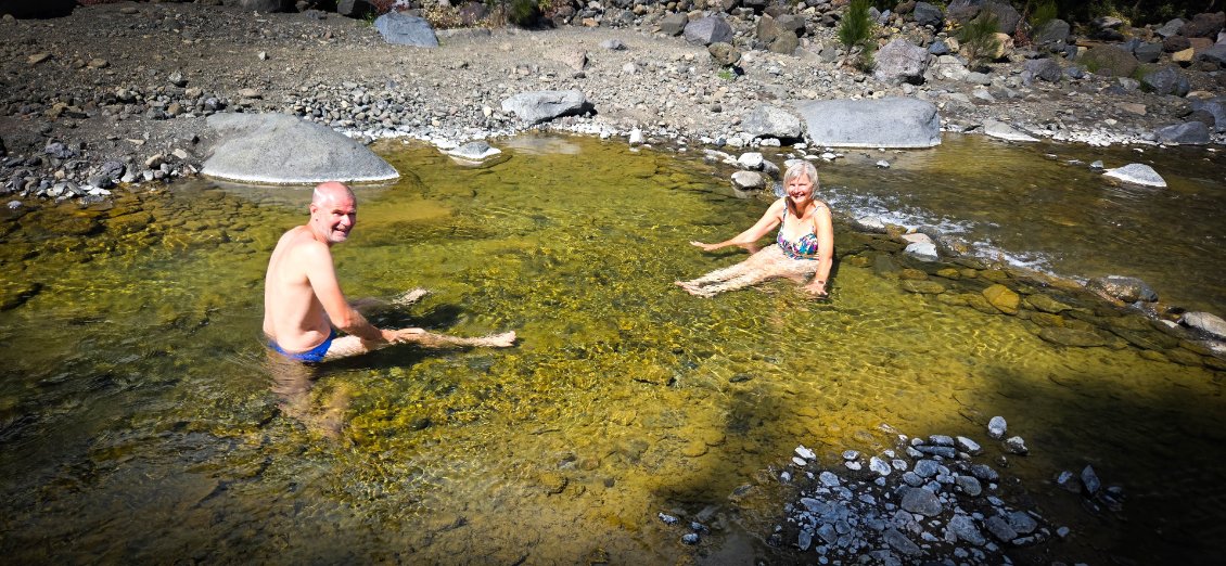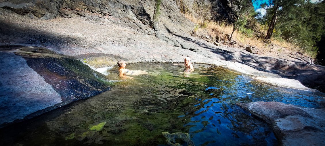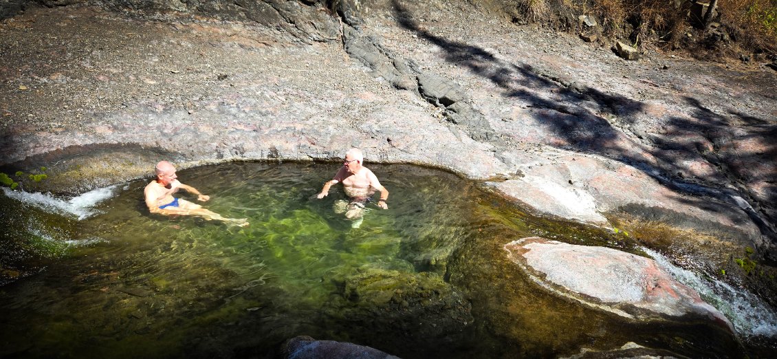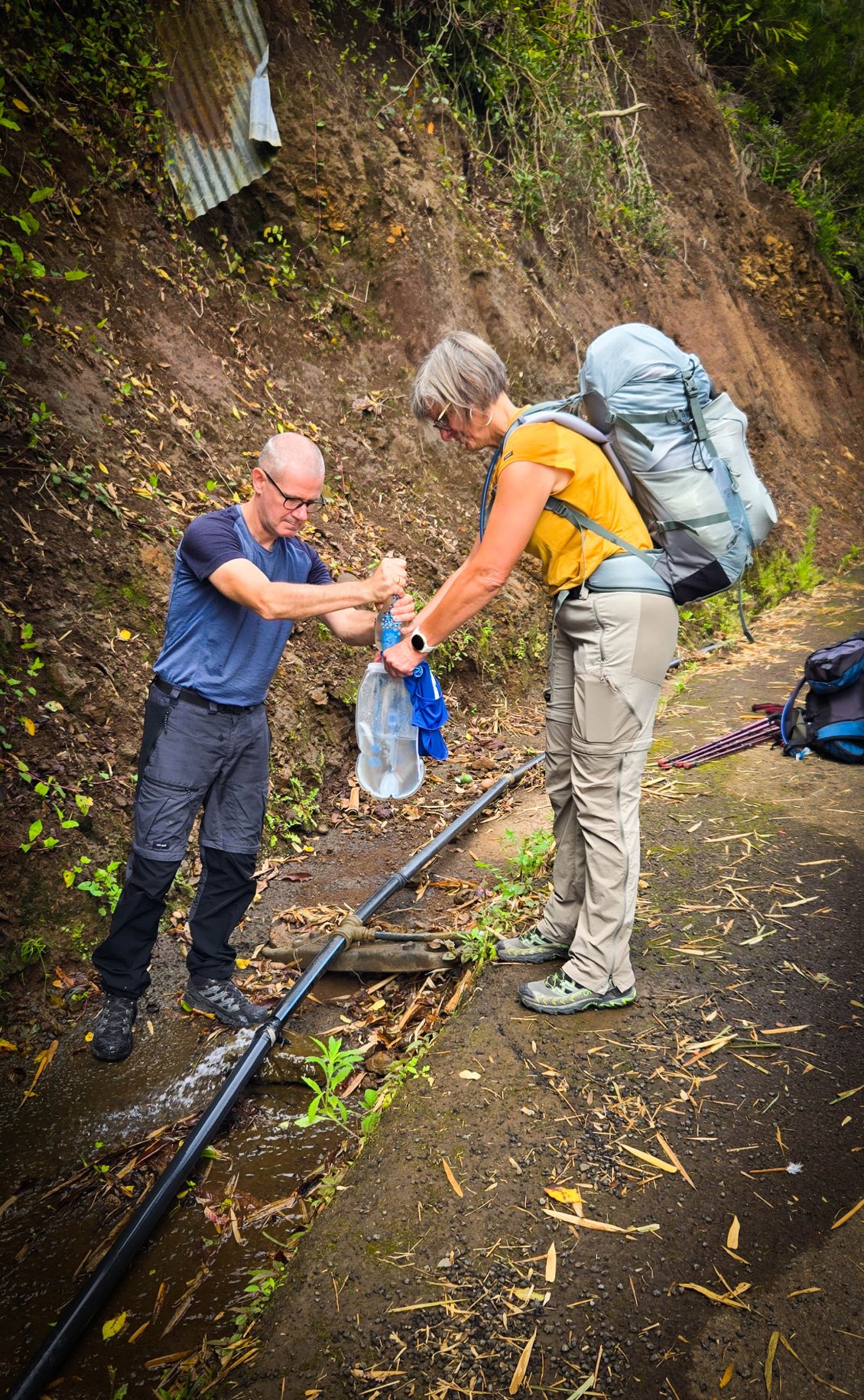 Et l'aventure commence bien… Gwen « perd les eaux » et se retrouve avec le dos complétement trempé. Le flexible de sa poche à eau s'est débranché dans son sac: 2 litres d'eau finissent par terre et plus rien dans la poche (cela rappelle à Thierry une mésaventure similaire lui étant arrivée lors d’une précédente randonnée). La fin de l'étape va se faire avec le gosier bien sec et le dos bien mouillé. Nous continuons mais nous sommes à l'affut de la première opportunité pour faire le plein d'eau. Celle-ci se présente quand nous trouvons une conduite d'eau qui fuit. On sort la gourde filtrante, et le plein est fait rapidement.