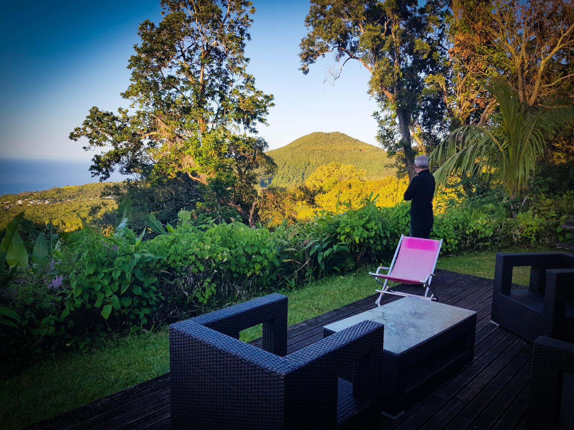 Ce gite est extraordinaire, en plein milieu d'une forêt bien dense mais avec une vue à couper le souffle sur l'océan Indien. Notre hôte entretient seul son domaine. Et son amour pour les fleurs et le jardinage est partout présent.