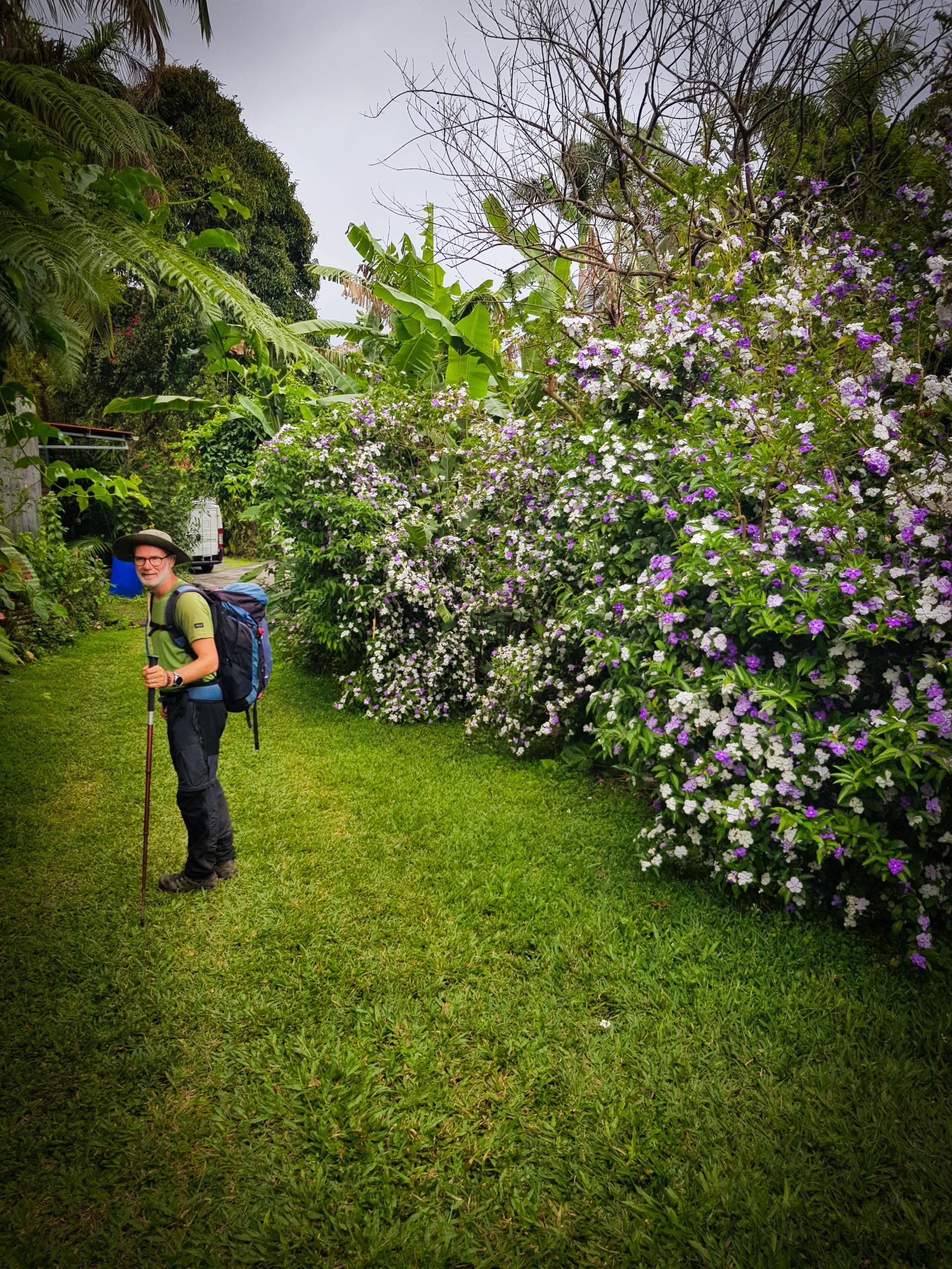La fin de l'étape se fait en partie sur une piste goudronnée puis sur un sentier hors GR pour rejoindre notre gite. Peu empruntée, la trace n'est pas des plus faciles: beaucoup de pierres et de mousse bien glissantes. Mais voilà… Nous sommes au gite. Et LA… Quelle surprise. Une végétation luxuriante avec plein de fleurs partout.