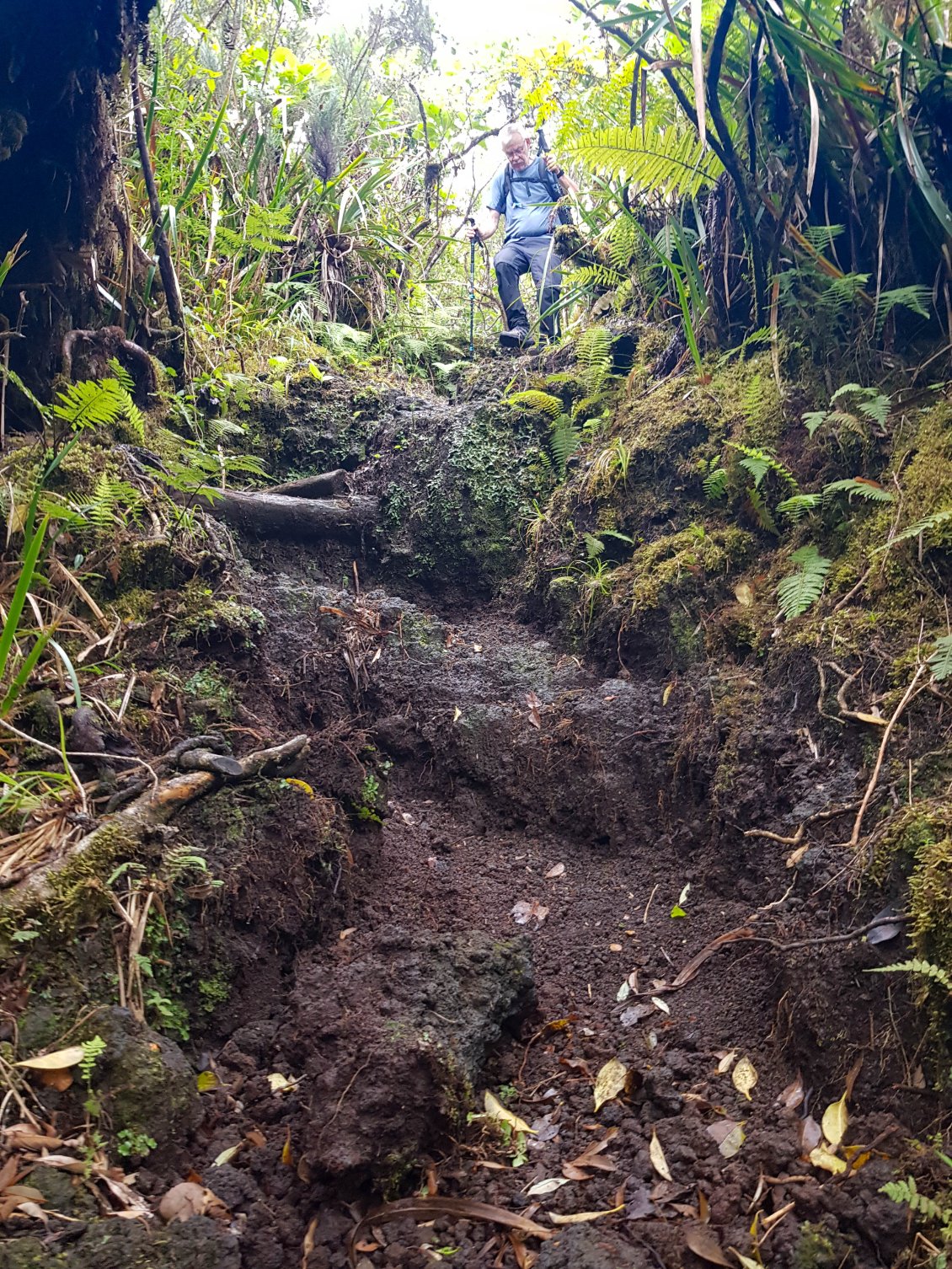 La végétation change et devient plus imposante. Ce côté de l'île étant plus exposé aux pluies, la végétation devient tropicale: une vraie jungle. Des arbres biscornus avec beaucoup de mousse et de fougères nous entourent. Cela veut également dire beaucoup de racines glissantes. La vigilance est encore et toujours de mise.