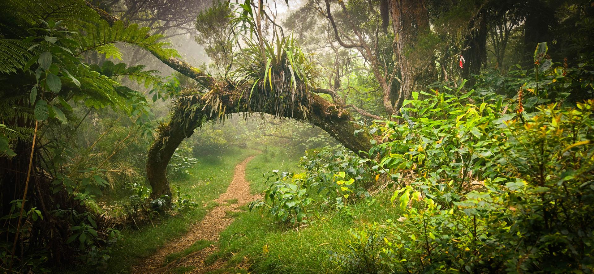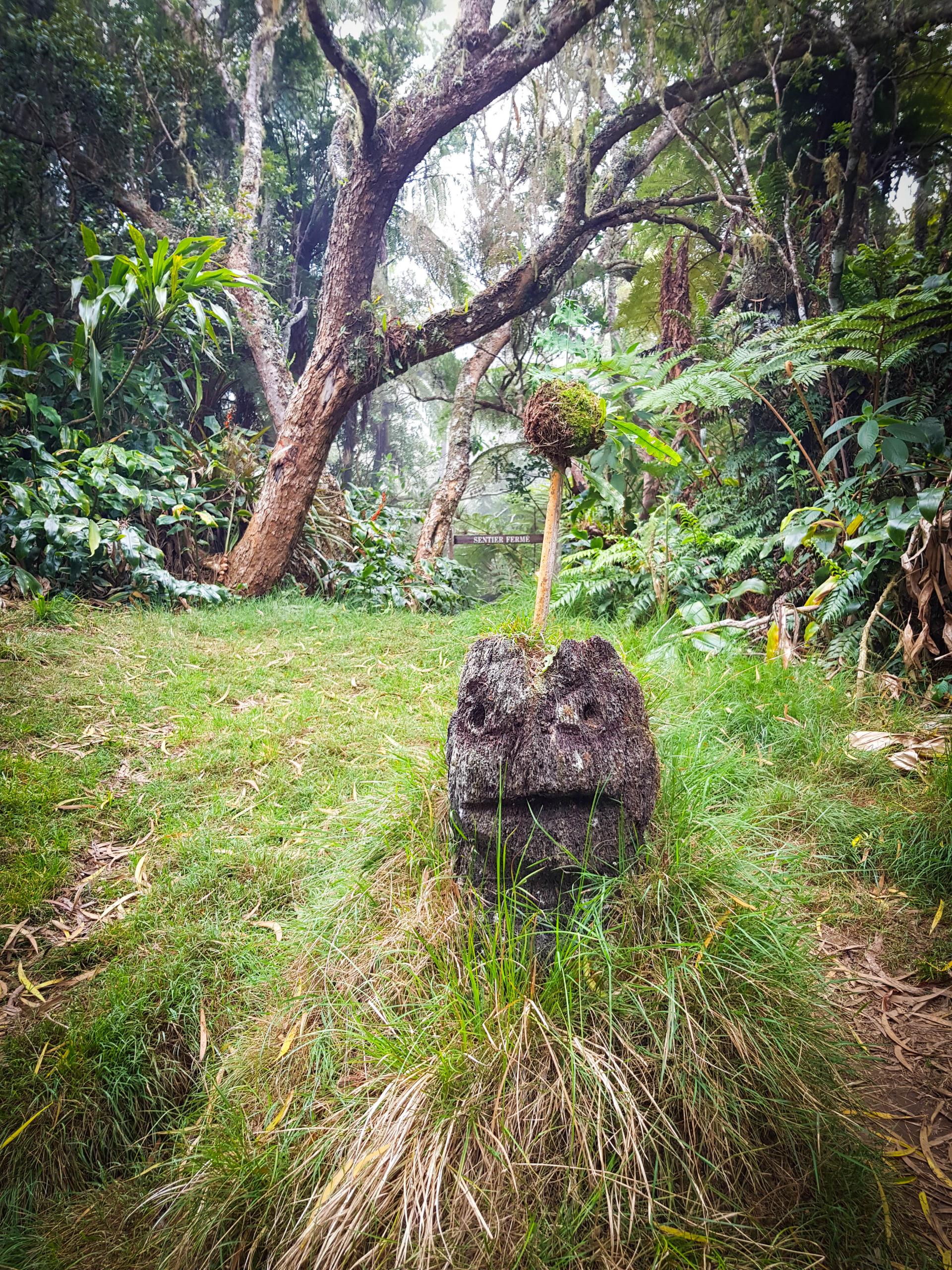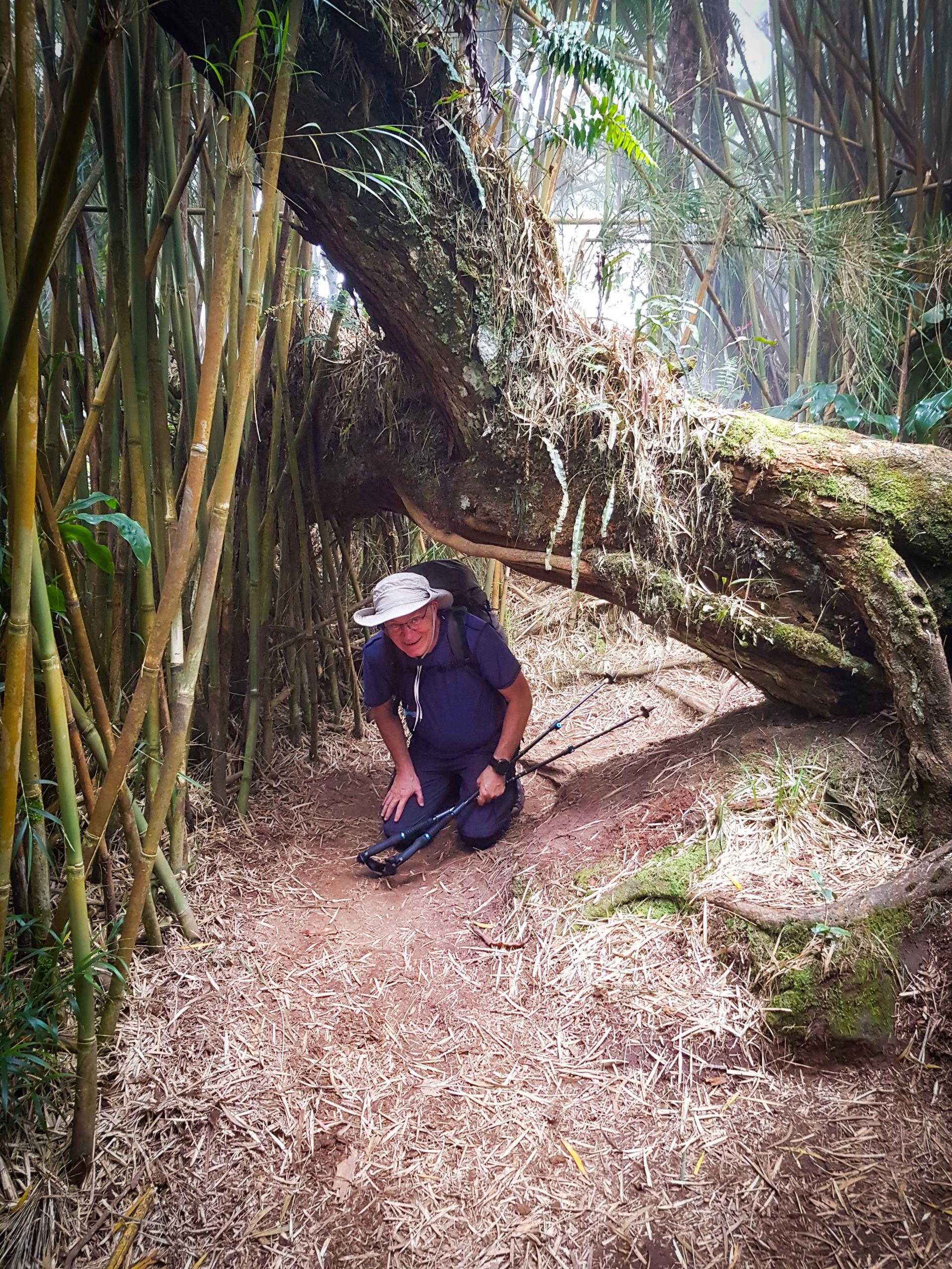 Sans être grand beau, le temps est clément. La première partie se fait en sous-bois. Mais avec une végétation très particulière faite d'arbres tortueux et couverts de mousses, de bambous... une végétation toute nouvelle pour nous, alors nous ne boudons pas notre plaisir, même si nous devons nous contorsionner pour passer sous les arbres.