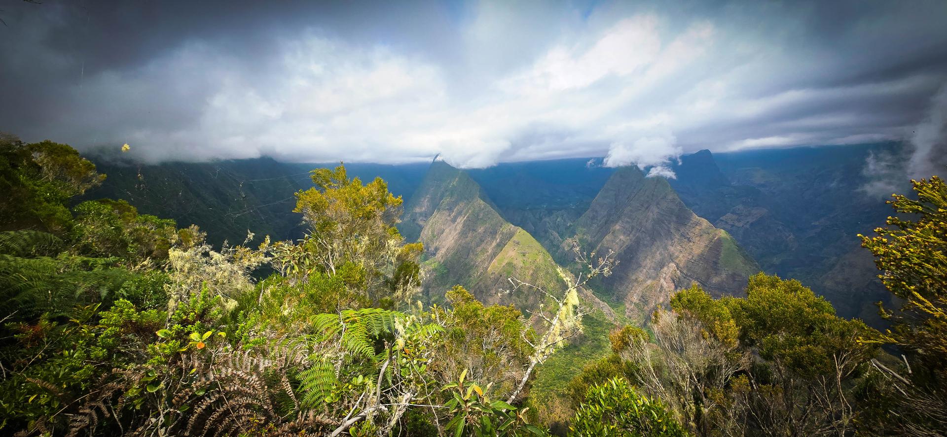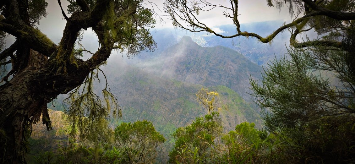 Pour la fin de l'étape, on marche sur une crête avec d'un côté le cirque de Mafate, et de l'autre Dos d'Ane... mais vraiment sur la crête, le truc tout pointu en haut d'une montagne... Partout ailleurs, on n’oserait pas s'y aventurer, mais ici la végétation environnante nous protège du vide et la peur du vide ne se fait pas ressentir. D'ailleurs, cette végétation est surprenante malgré la verticalité du relief: celle-ci est présente!!!