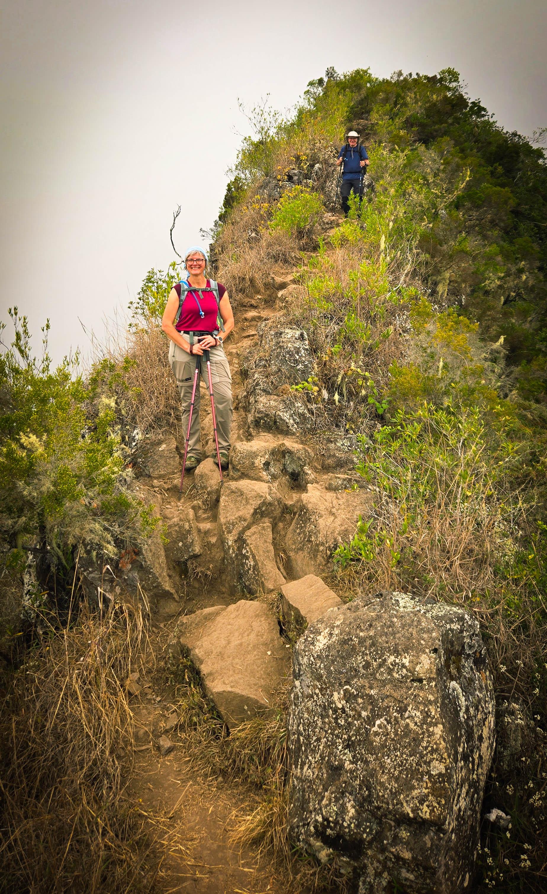 Globalement nous descendons mais en fait nous descendons 15m puis juste après nous en remontons 5... Et surtout il y a plein de marches.... A monter... A descendre... On va en bouffer toute l'étape. Le terrain est particulièrement difficile avec beaucoup de racines glissantes: la vigilance est de mise; impossible de prendre un rythme…c’est interminable. On se rend compte que l’entrainement dans nos montagnes ne nous a pas forcément bien préparé à ce type de terrain vraiment très particulier.