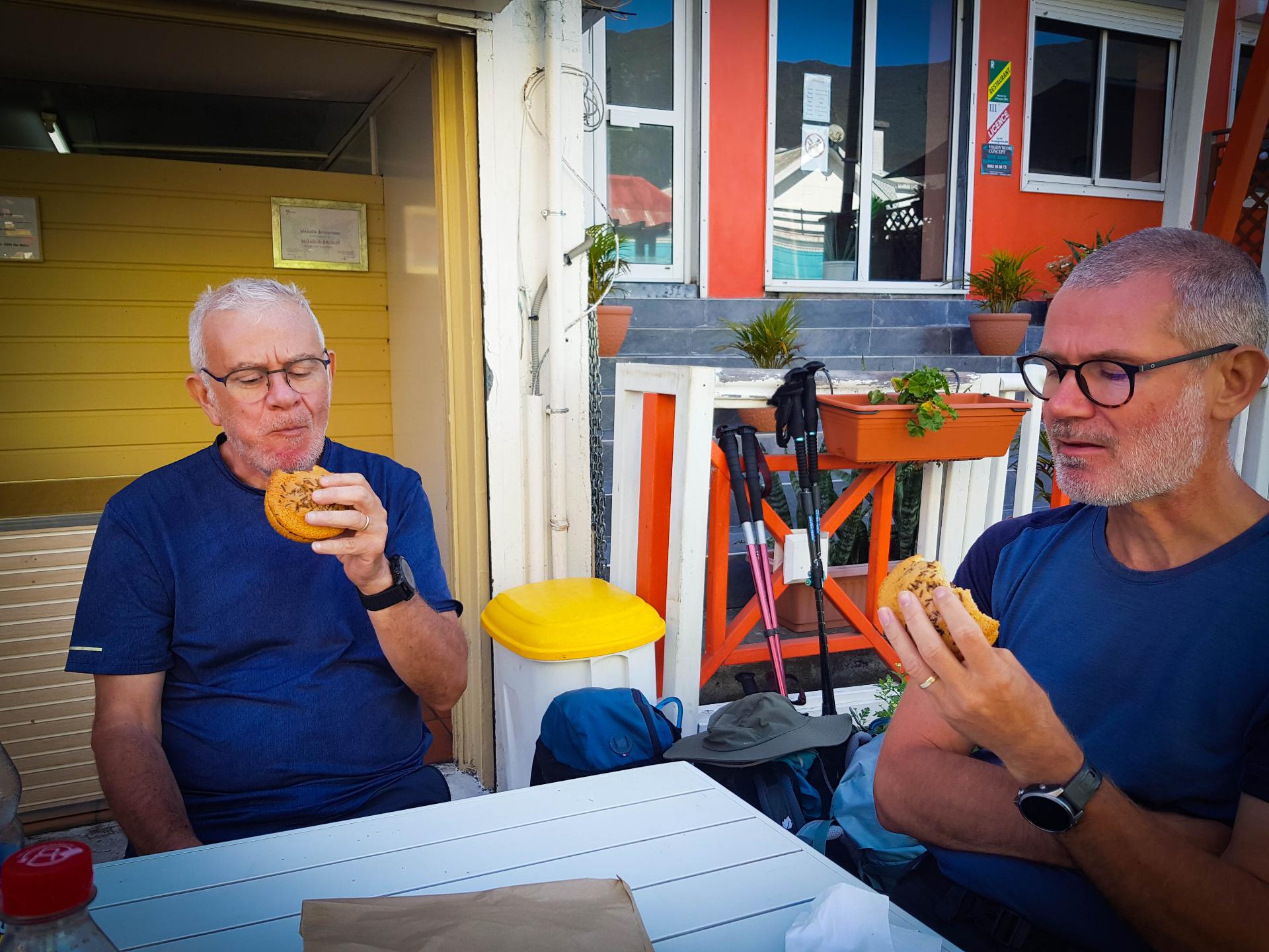 La veille, on nous a vanté une petite boulangerie qui ne paie pas de mine mais qui a semble-t-il, de quoi se délecter. Direction le centre de Cilaos, la boulangerie est vite trouvée et nous nous installons en terrasse pour nous délecter de samossas et beignet au chocolat. 7h30 pour réaliser l'étape: il faut bien ça pour récupérer.
