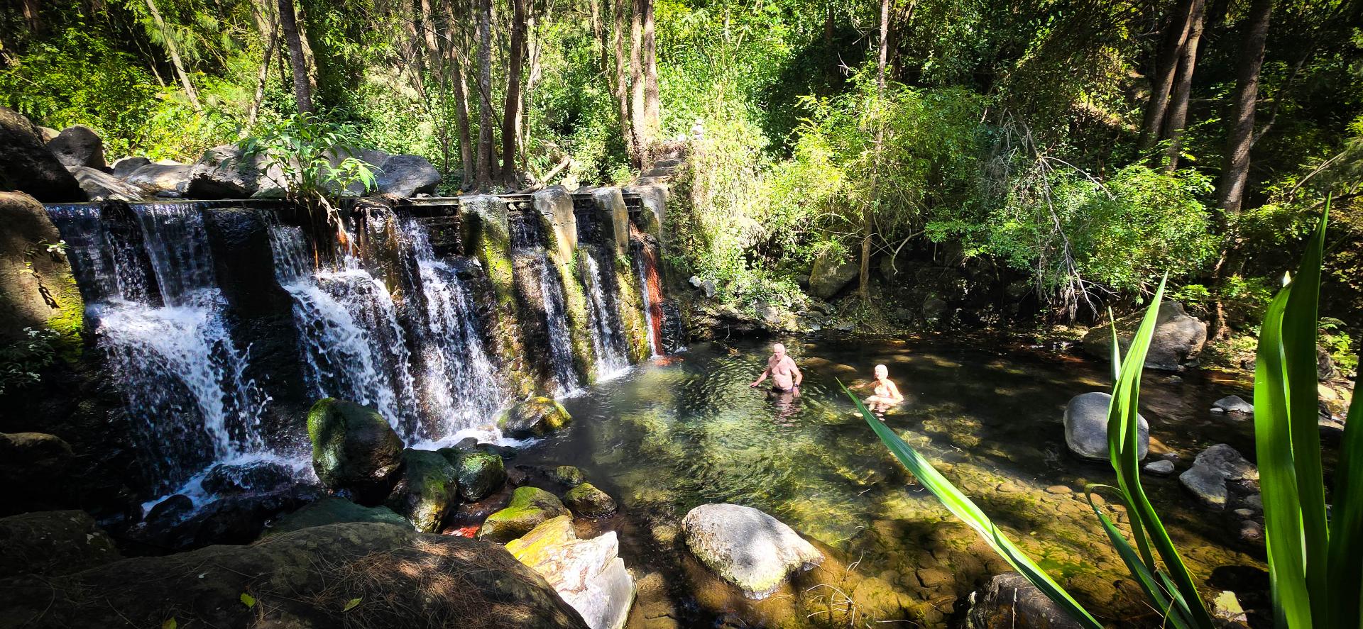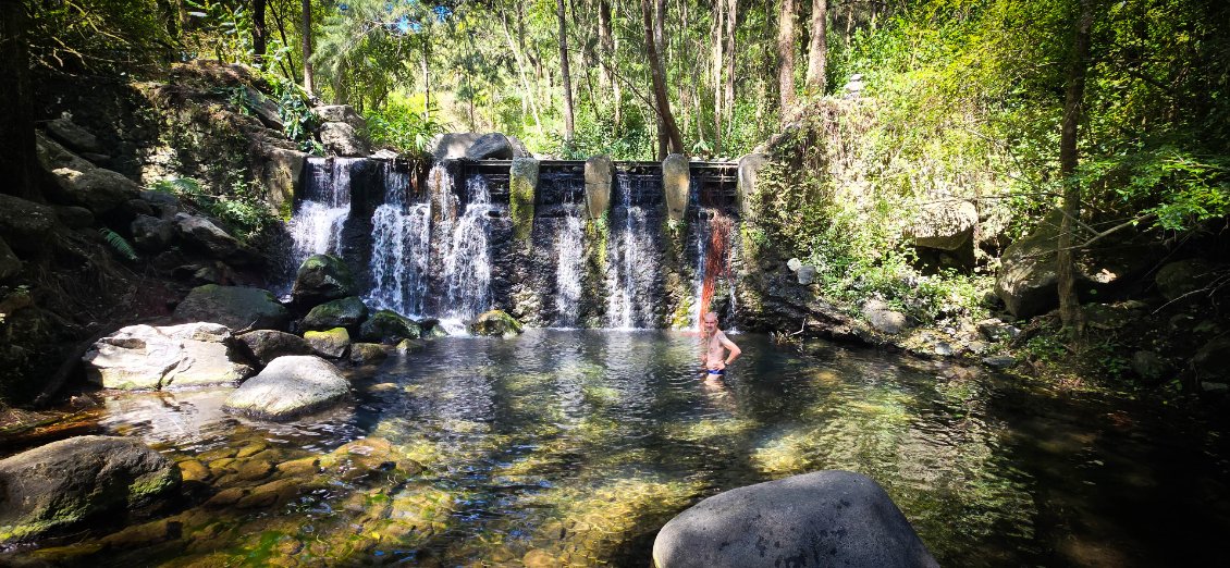 On a bien envie de profiter de l'endroit pour un petit bain. Mais il y a un peu de monde, alors on pousse jusqu'au deuxième bassin. Ici, il n’y a personne, alors on revêt notre maillot, et on fait trempette. Il fait chaud et après cette longue descente, l'eau parait bien fraiche. Mais cela fait un bien fou.