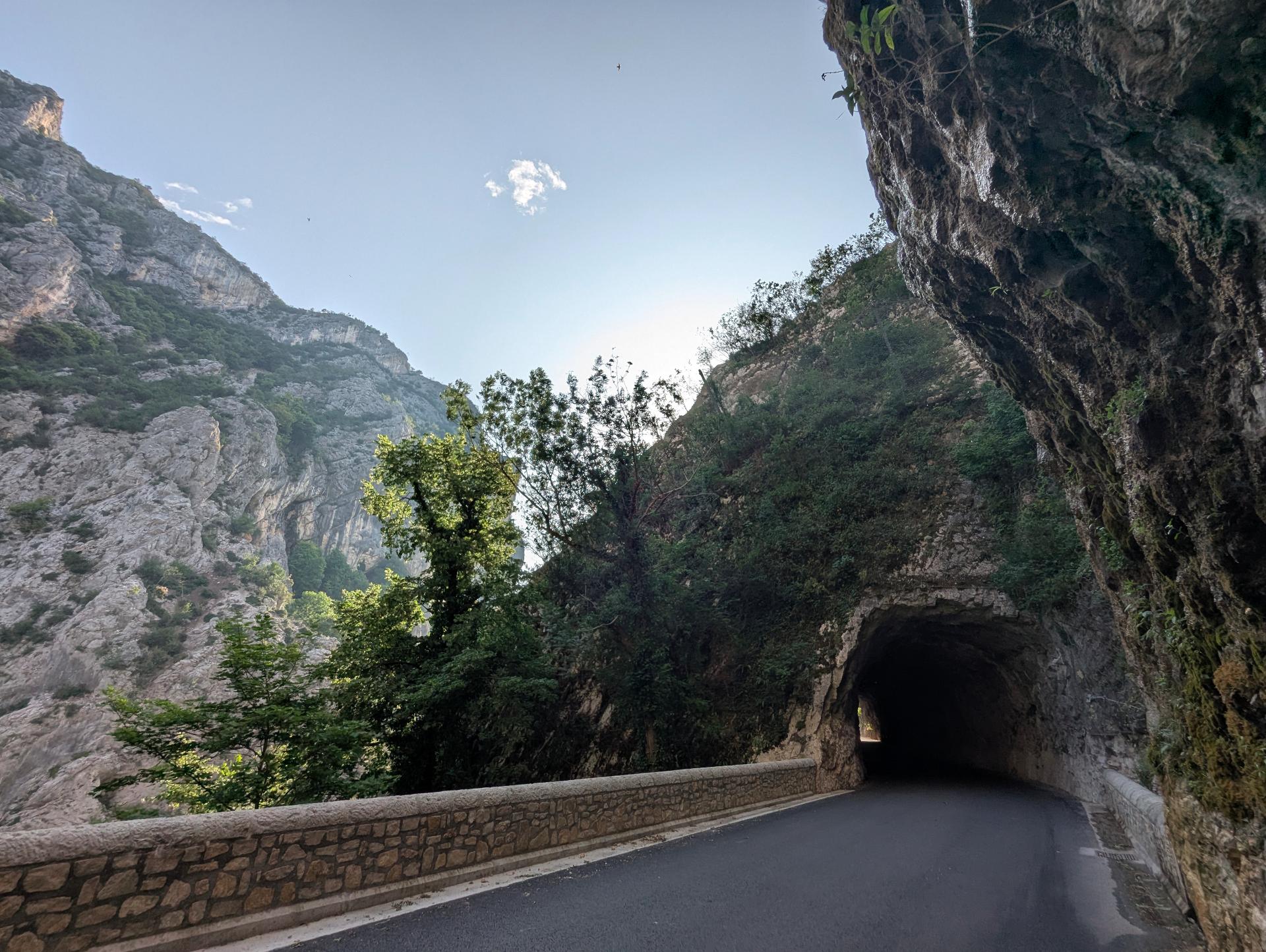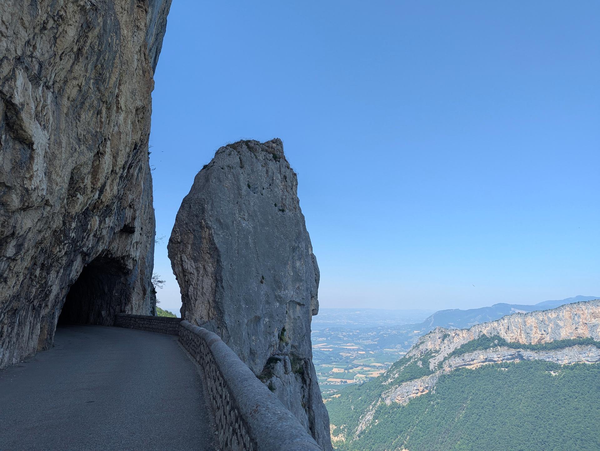 Après une belle pause au frais, au col de la Machine, je descends dans le Royan pour profiter de cette magnifique route sculptée à flan de falaise, dévoilant une partie des faces Ouest de la forteresse.
