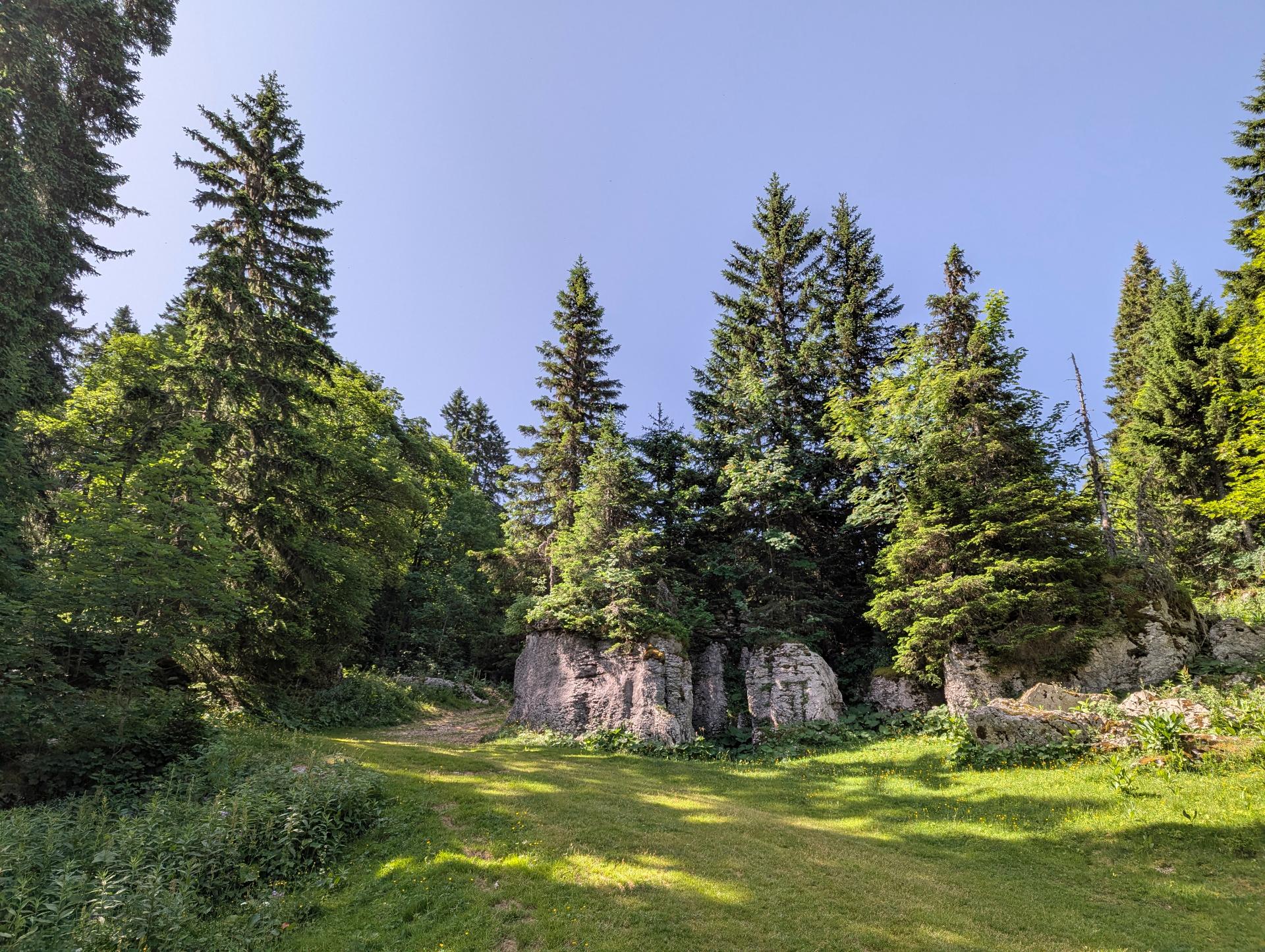 La forêt s'ouvre peut à peut en arrivant sur le plateau et laisse place à des prairies fleuries.