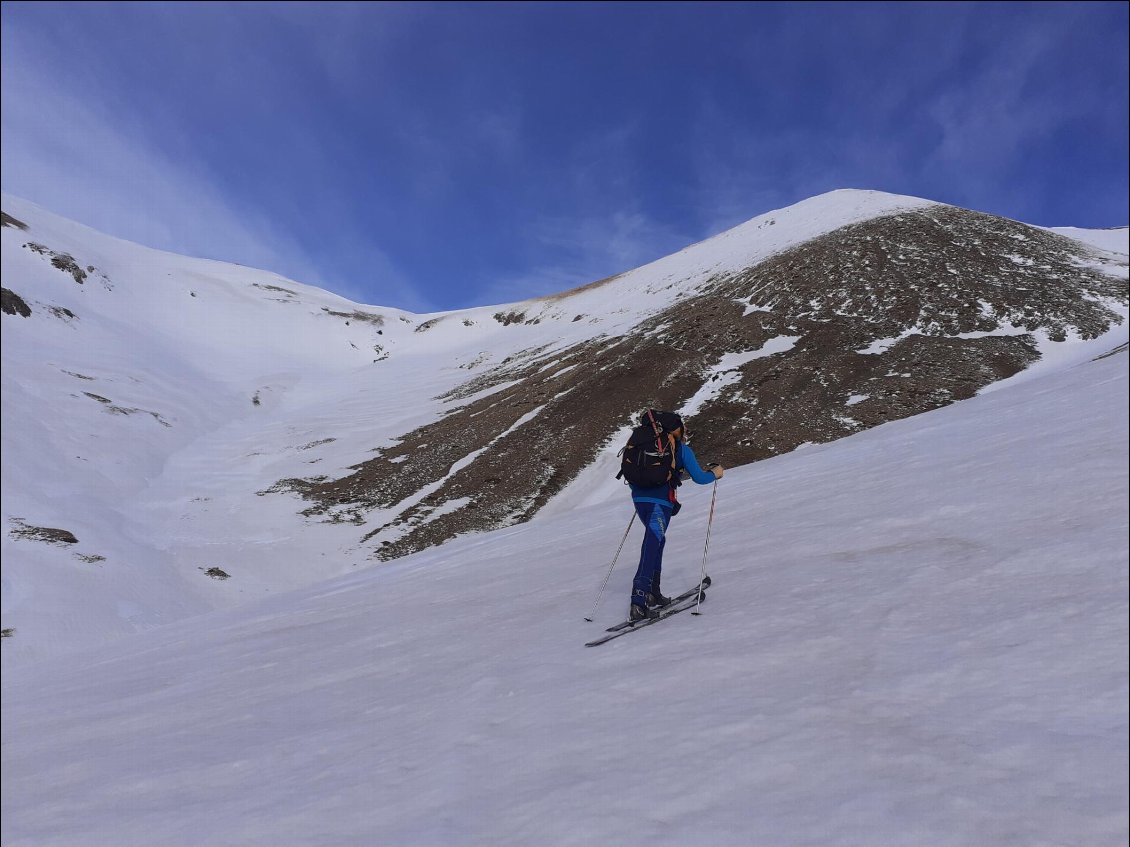 La descente se répète derriere les cols, toujours skiable et plutôt agréable, à chaque fois, le vent nous épargne, la chance est avec nous..