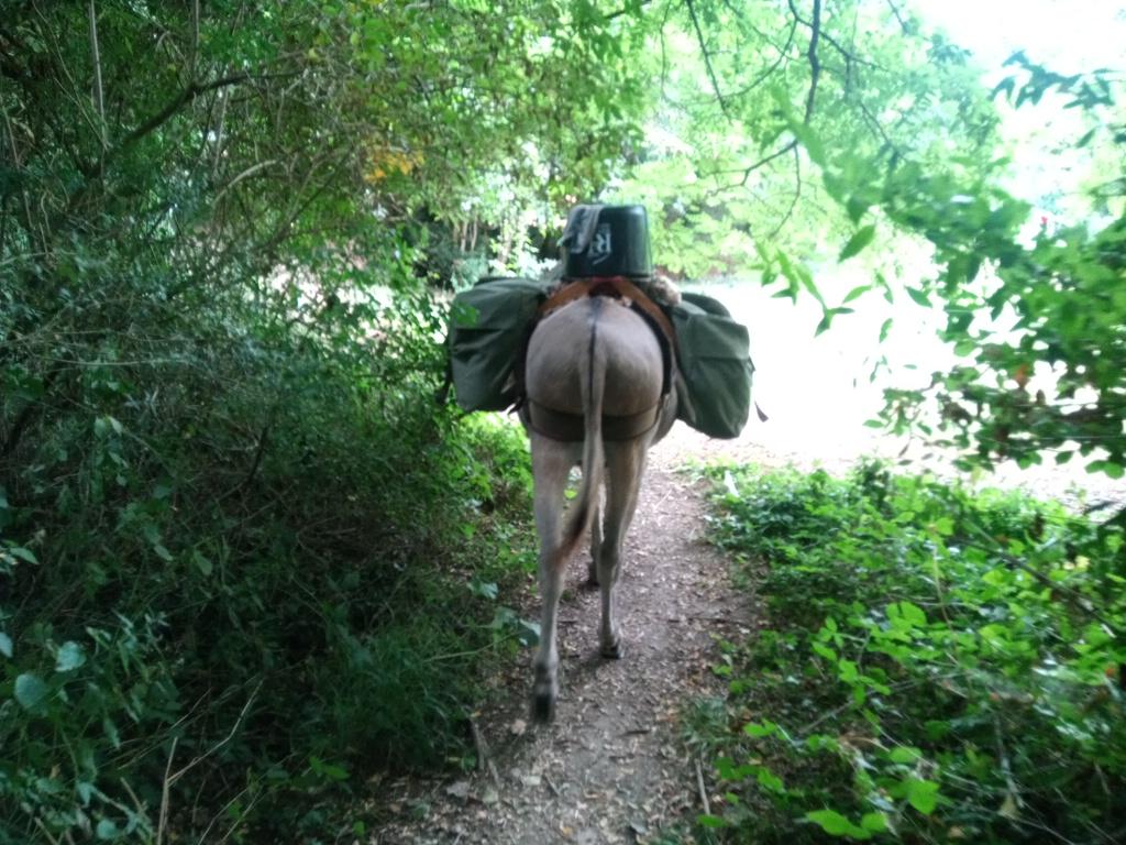 Étape assez vallonnée qui suit un terrain assez varié. La technique est au retour. Nous devons descendre un petit enrochement et passer une passerelle de 80 cm de large sans garde-fou. Les 2 ânes sont exemplaires. Seules quelques minutes sont nécessaires pour évaluer les obstacles.