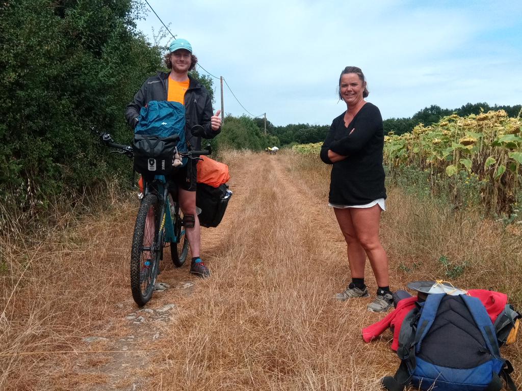 Un peu plus loin, nous rencontrons Joris. Il est parti de Royan avant-hier et se dirige vers la Méditerranée en suivant le GR4. Il voyage au profit de l'association "petit prince". Cette asso réalise les rêves et les projets d'enfants gravement malades. Bel échange de souvenirs, d'adresses, de tomates...Bonne route à toi Joris. Vous pouvez soutenir son action en vous rendant sur le site https://www.alvarum.com/jorisfernouxjorisfernoux