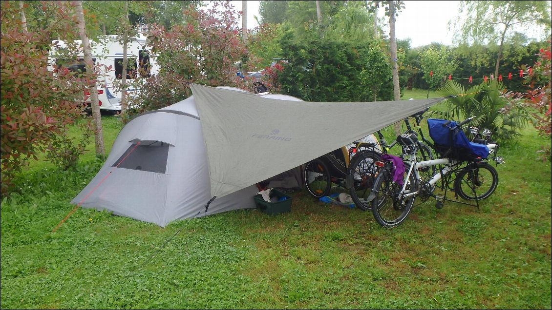 Nous faisons sécher la tente et pendant que l’on range éthan fait le palefrenier avec son fidèle serviteur Maylis… 12h30 quand on décolle après avoir attendu la responsable du camping… facture 82 E pour 4 nuits, pt dej, lait , birra aperol… en plus c'était une super adresse!!