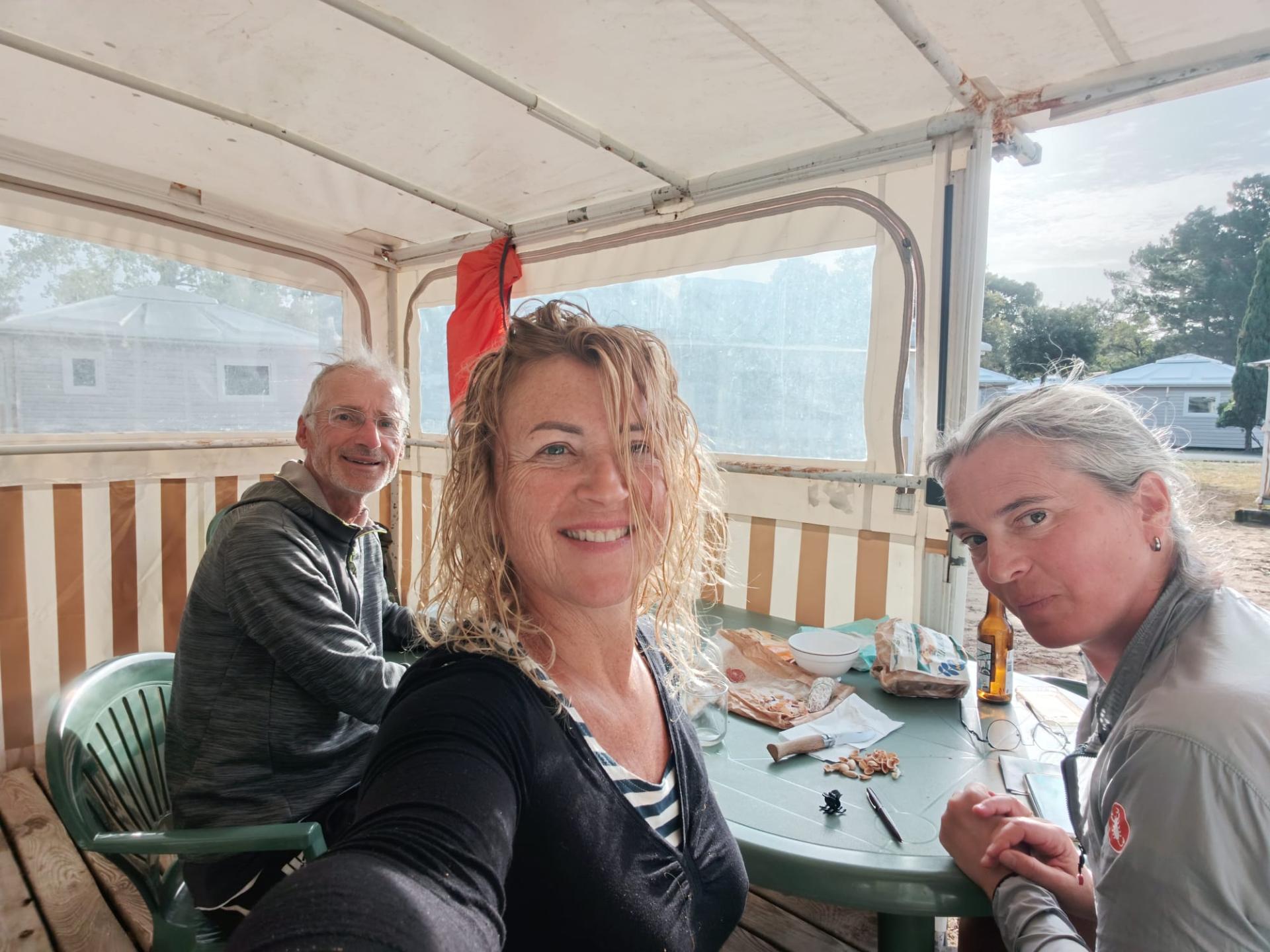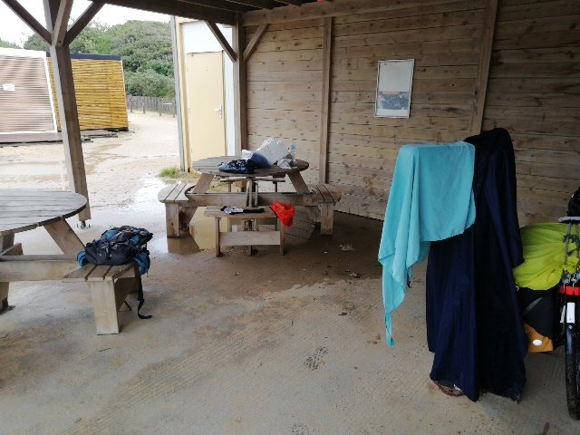 État des lieux le matin. Je décide de visiter île en vélo mais après 2h, le temps ne se lève pas et je rentre camping pour séchage et pliage pour retour à 19h par le ferrie pour La Rochelle camping ou m'attende les copines.