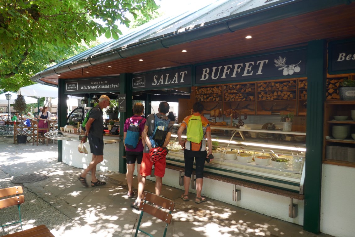 Repas dans un biergarten avec terrasse ombragée pour découvrir quelques spécialités locales dont la Linz Torte.