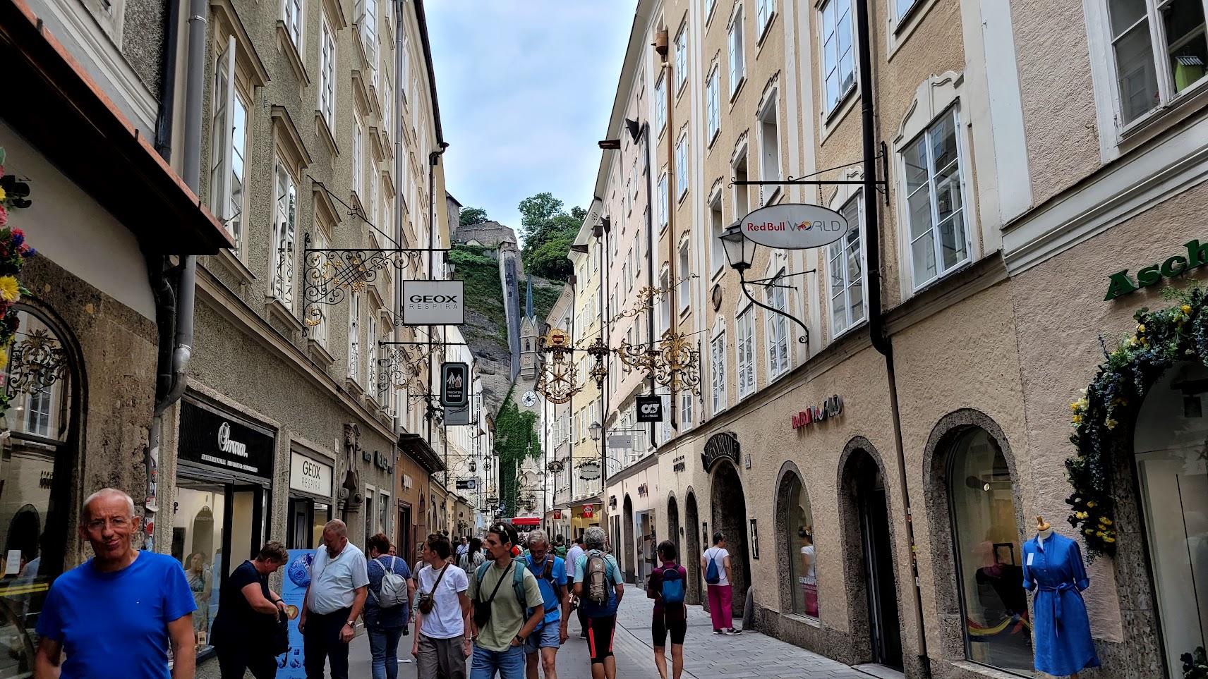 En approchant, nous découvrons une véritable forêt de clochers. La ville est enserrée entre 3 collines et traversée par la rivière Salzach. Tout le centre ancien est piéton et nous abandonnons vite nos vélos pour déambuler dans la vieille ville à pied. L’esprit de Mozart imprègne chaque ruelle. Son image est surexploitée à des fins touristiques. Déjeuner agréable dans un petit restaurant, à l’écart de la foule, dans une cour ombragée.