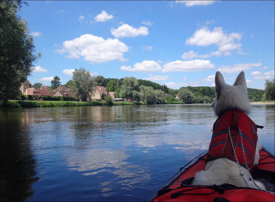 Le pont du Guétin - On a fait glisser le kayak le long de la digue de rochers et au bout il faut dynamiquement remonter dans son kayak. Avec le chien, la manip n'est pas évidente. Il doit être habile pour ne pas tomber à l'eau, c'est abrupte sur les rochers. Des badauds nous observent du pont. Sous les regards amusés des vacanciers, il réussit, comme un pro à s'installer à l'avant du kayak. Ouf, l'honneur est sauf!