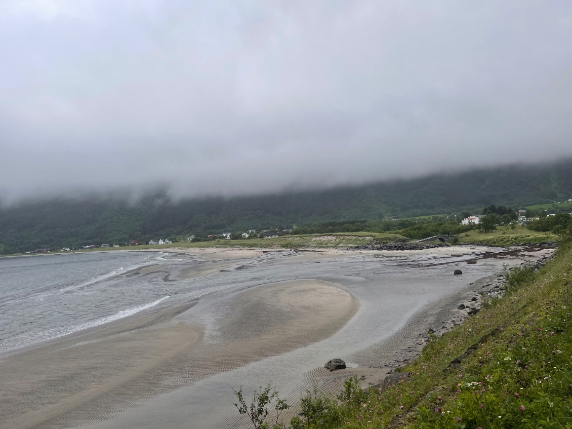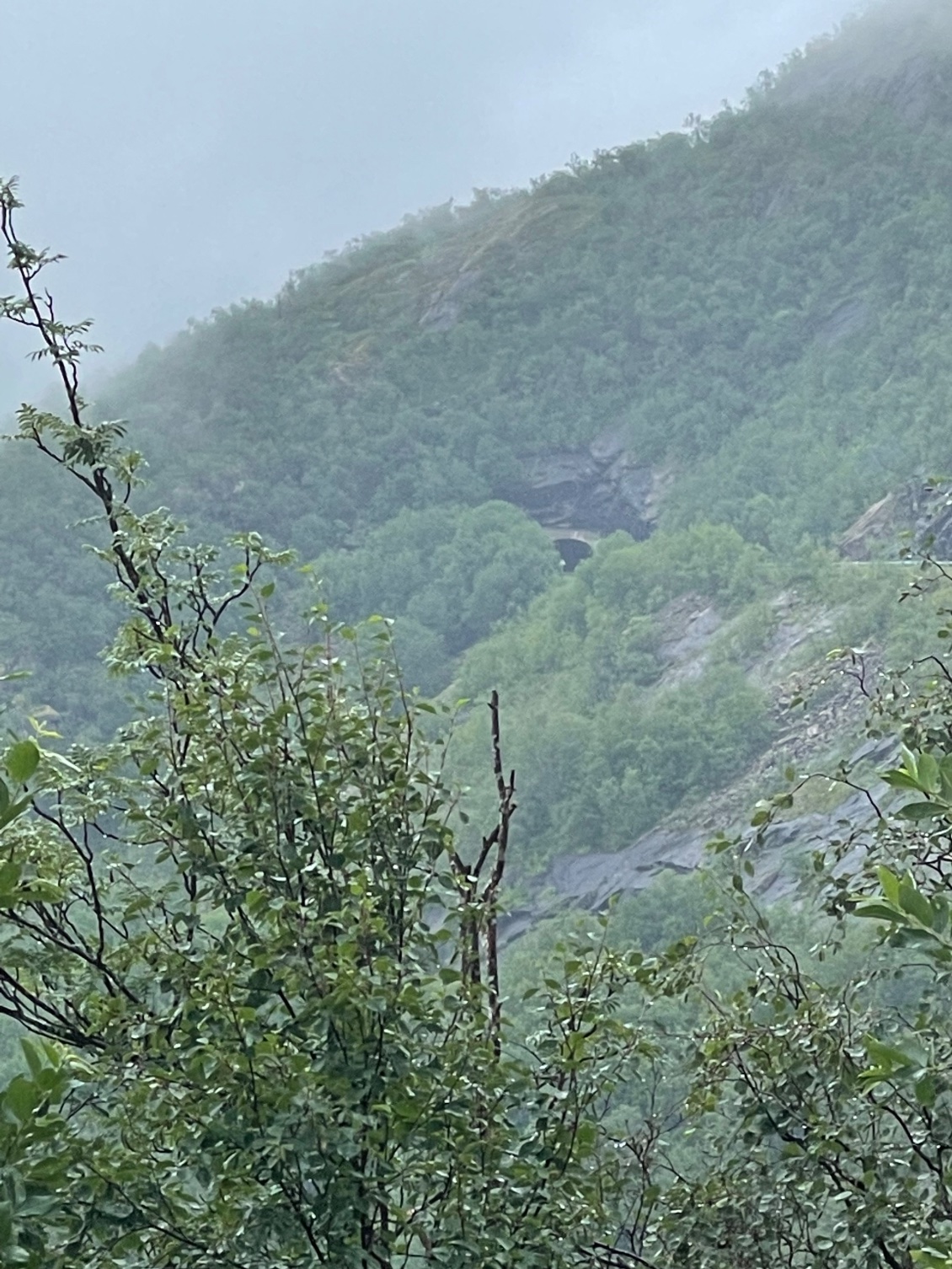 Je ne dois plus traîner… Il pleut par alternance, ce qui me permet de sécher. Mais c’est toujours comme ça, il pleut systématiquement entre dix-sept et vingt heures. J’ai des chaussures Scarpa en Gore Tex. Mais elles ne sont pas parfaitement imperméables ! J’ai jeté mes surchaussures en lambeaux au profit d’autres achetées à Brønnøysund. Comme je parcours les montagnes norvégiennes à pied, en poussant mon vélo, les surchaussures se gorgent d’eau et mes chaussures l’absorbent. Bref ! Je n’ai pas de solutions pour remédier à ça. Cela n’a pas d’importance, je dois faire avec ce que j’ai et sauvegarder tout mon espace mental pour apprécier mon merveilleux voyage.