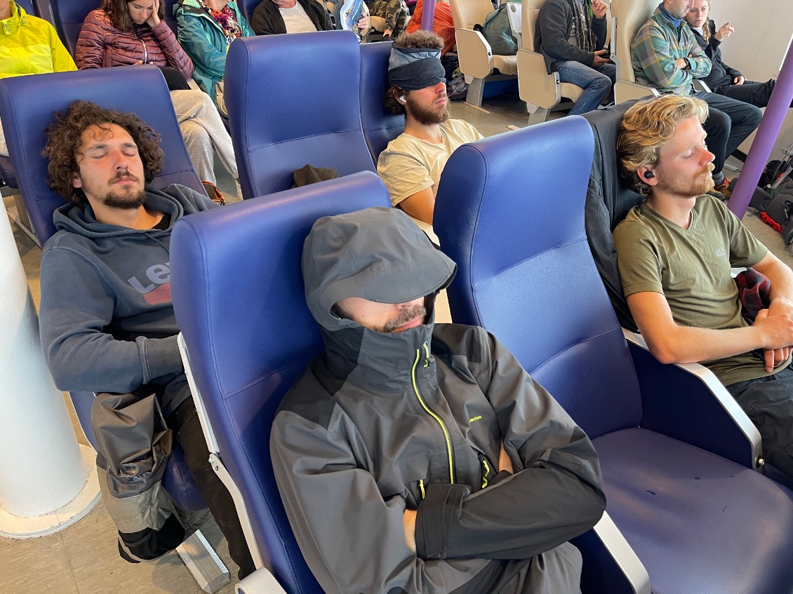 Et patatras ! J’arrive dix minutes en retard, le dernier ferry de la journée est déjà parti. Les garçons sont dépités de me savoir bloquée de l’autre côté du fjord. Puis tout s’illumine étant donné que Paul arrive. Il s’est arrêté faire quelques courses et cela lui a été fatal ! Nous décidons de passer la nuit dans la petite salle d’attente du ferry. C’est parfait pour nous. Un cyclo-voyageur doit s’adapter, il doit trouver des solutions à toutes les situations.