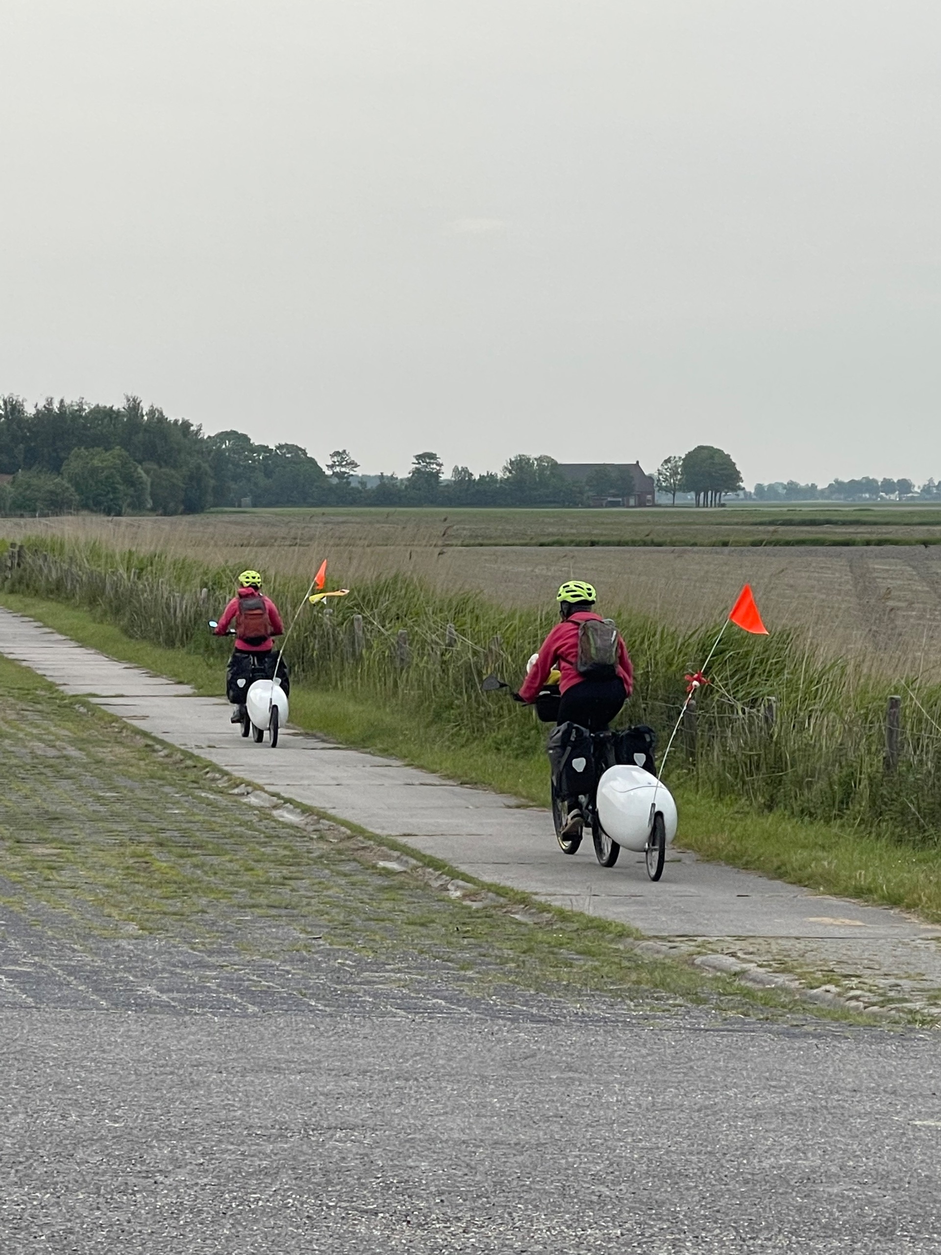 Ce que je sais, c’est que je dois utiliser une petite accalmie pour plier bagages. Je ne tergiverse pas, j’enfile mon équipement complet de pluie. La pluie mais surtout le vent sont redoutables aujourd’hui. Un bref coup d’œil au sens du vent et… il devrait me pousser ! En effet, j’ai l’impression que ma bicyclette a une assistance électrique. Enfin, pas toujours parce que pour rendre le parcours plus attrayant, je dois quitter la digue des moutons et faire des boucles avec vent de face pour passer dans les villages. Des villages fantômes bien souvent !