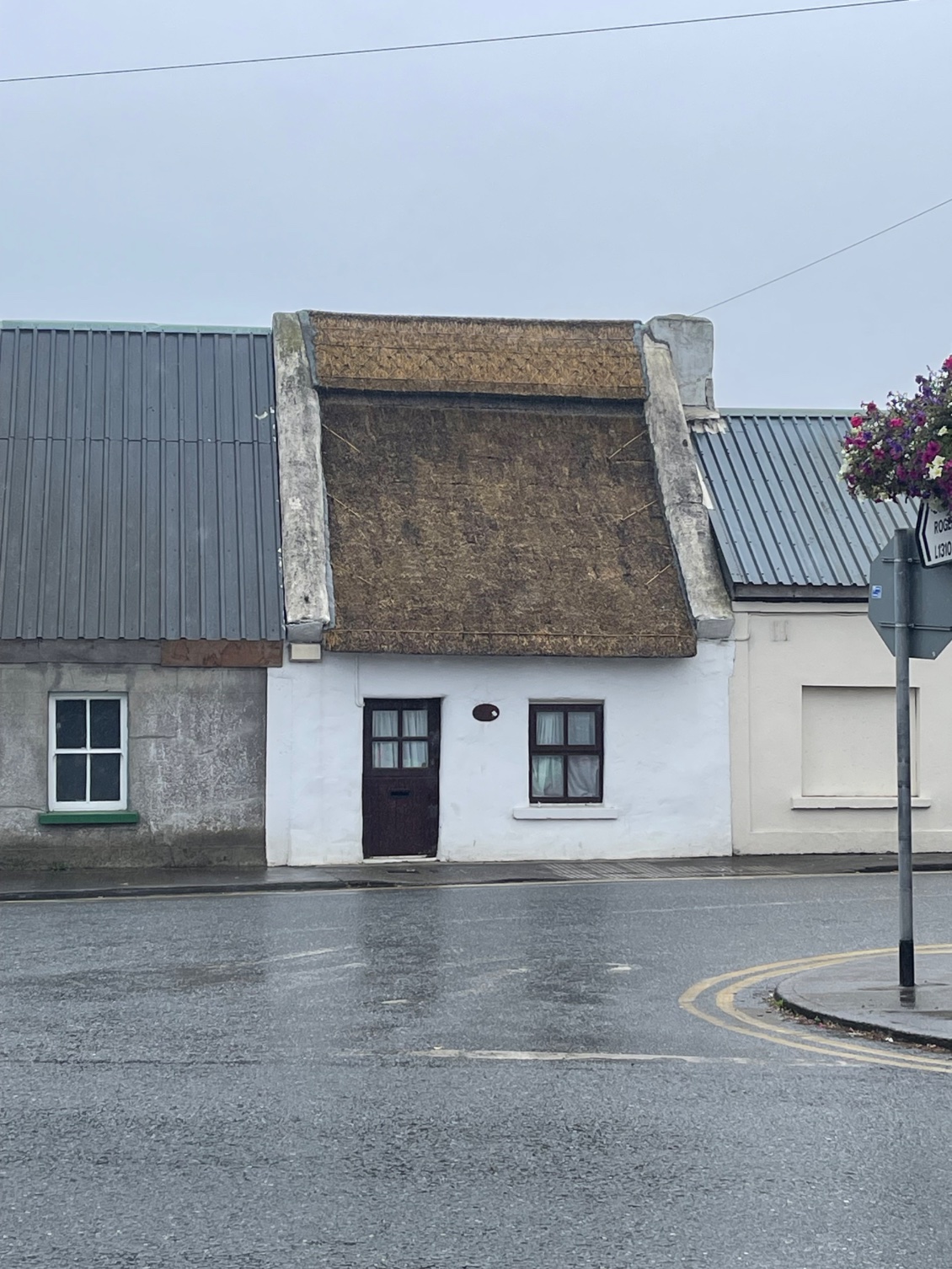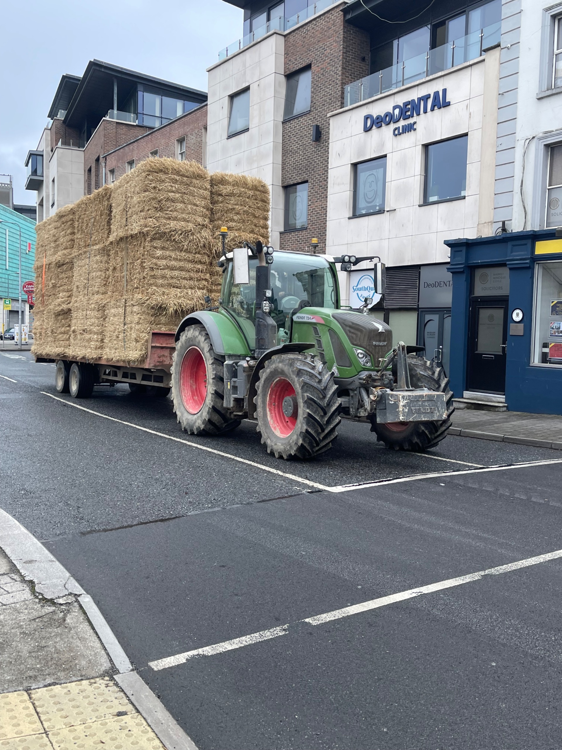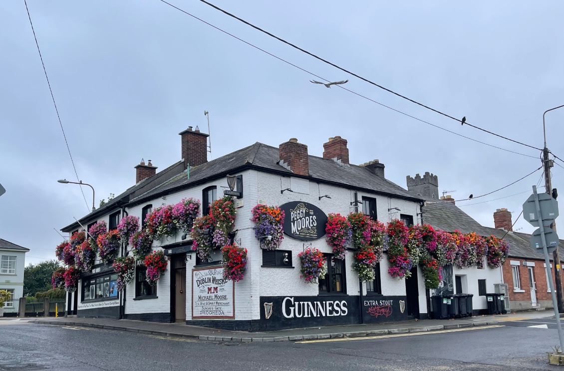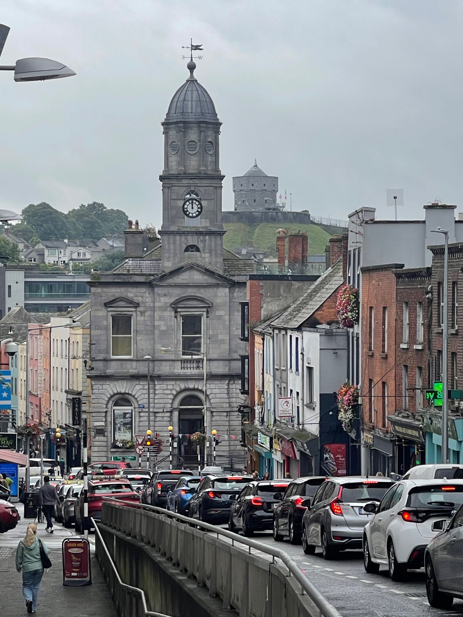 Le centre-ville me paraît bouillonnant de personnes qui vont en tous sens, de voitures prisonnières des bouchons, de ponts qui enjambent la Boyne. Où que je porte mon regard l’horizon est parsemé de clochers. Par leur traversée de la ville, des tracteurs aux plateformes chargées de bottes de paille contribuent aussi à l’effervescence. Au centre, les façades sont également embellies de jardinières aux fleurs tombant en grappes.