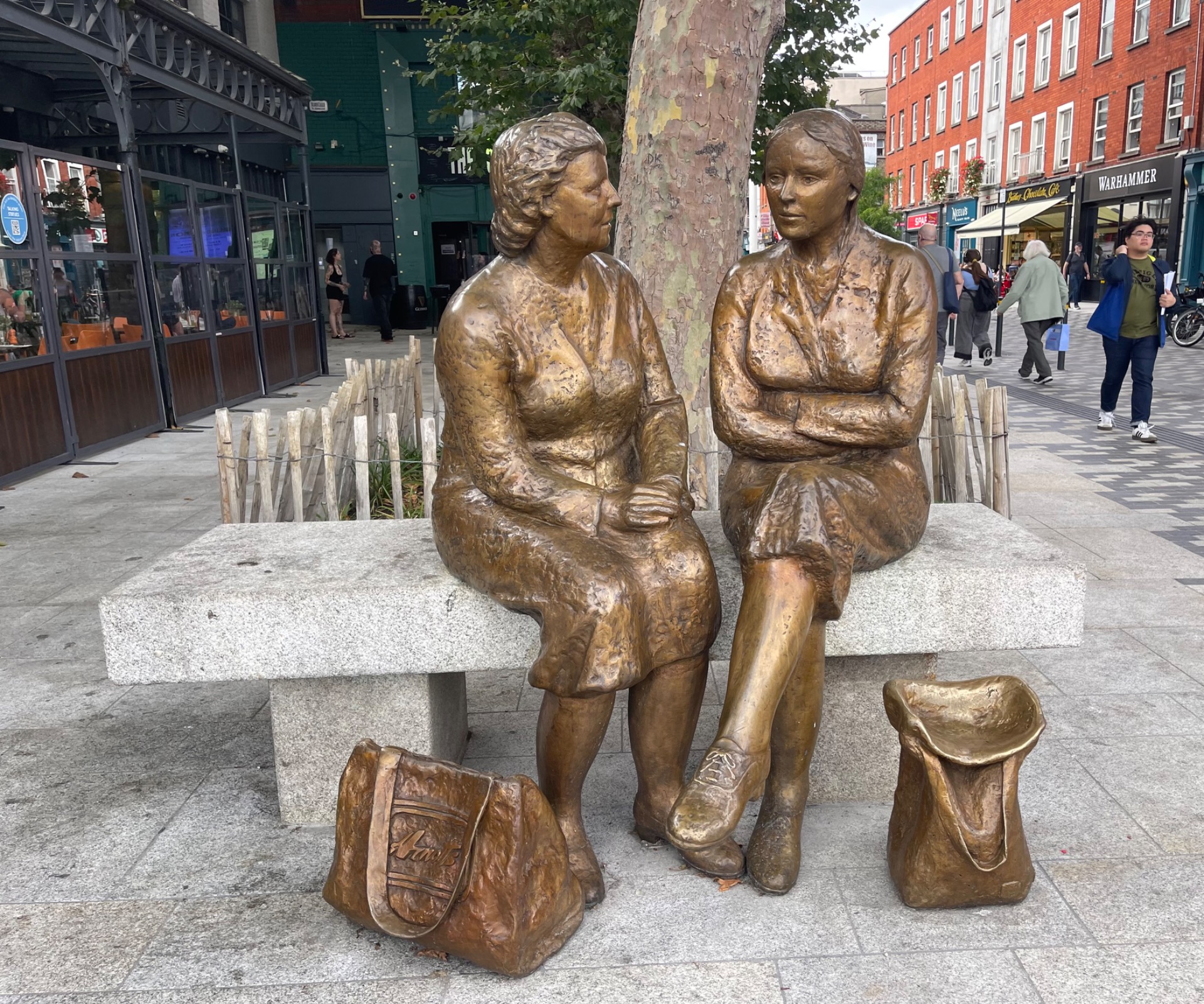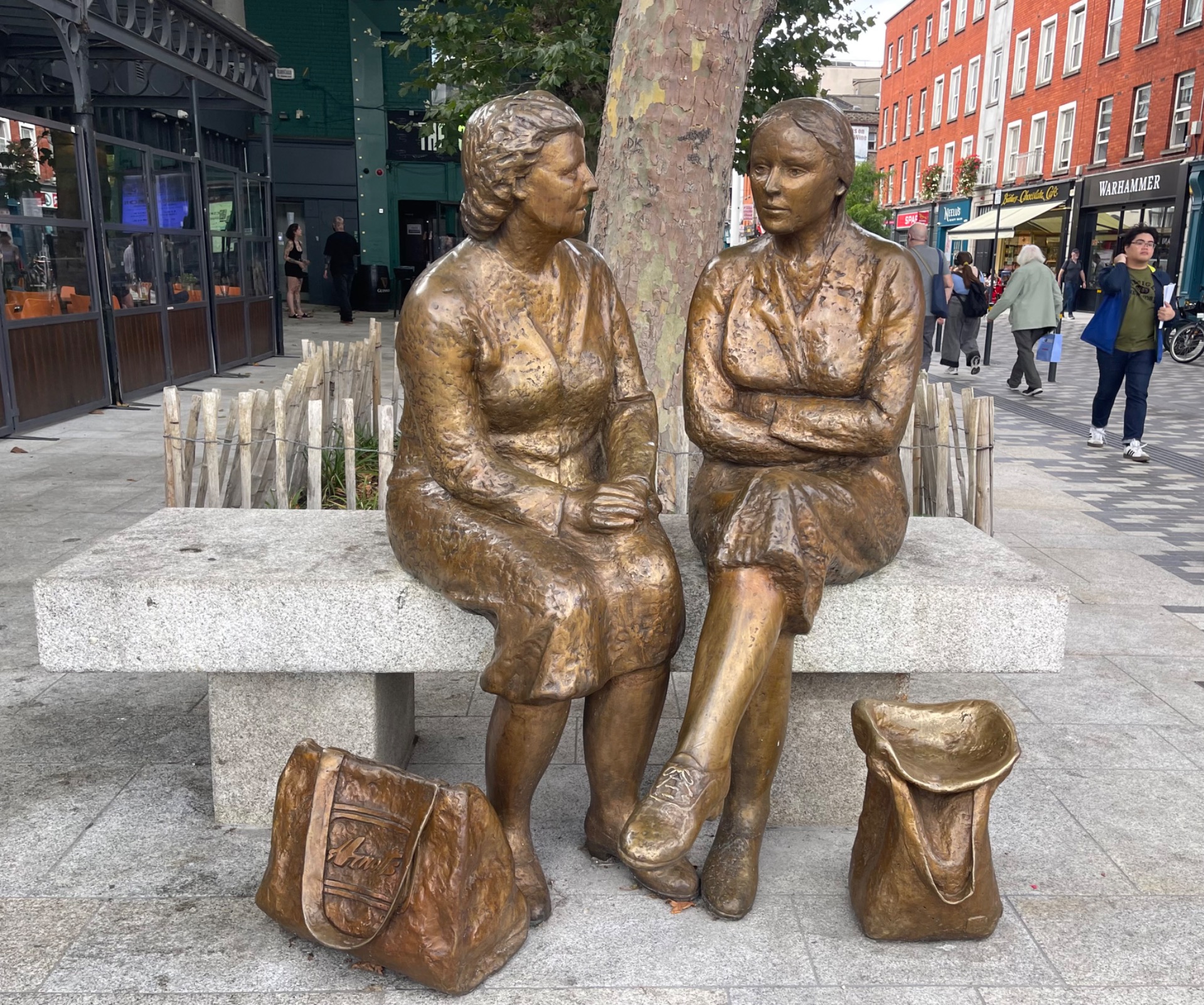 Avant de reprendre le bus qui doit me reconduire au camping à seize kilomètres, je fais un détour par Liffey street. Au bout de la rue, face au pont Ha’penny, la sculpture en bronze de Jackie McKenna, Meeting Place, réalisée en 1988, a été conçue pour refléter la vie quotidienne citadine. Deux femmes sont assises pour discuter, leurs sacs à leurs pieds. Il y a quelques années, l’un des sacs a été volé malgré son poids important. Aujourd’hui les deux sacs sont solidement fixés au sol.