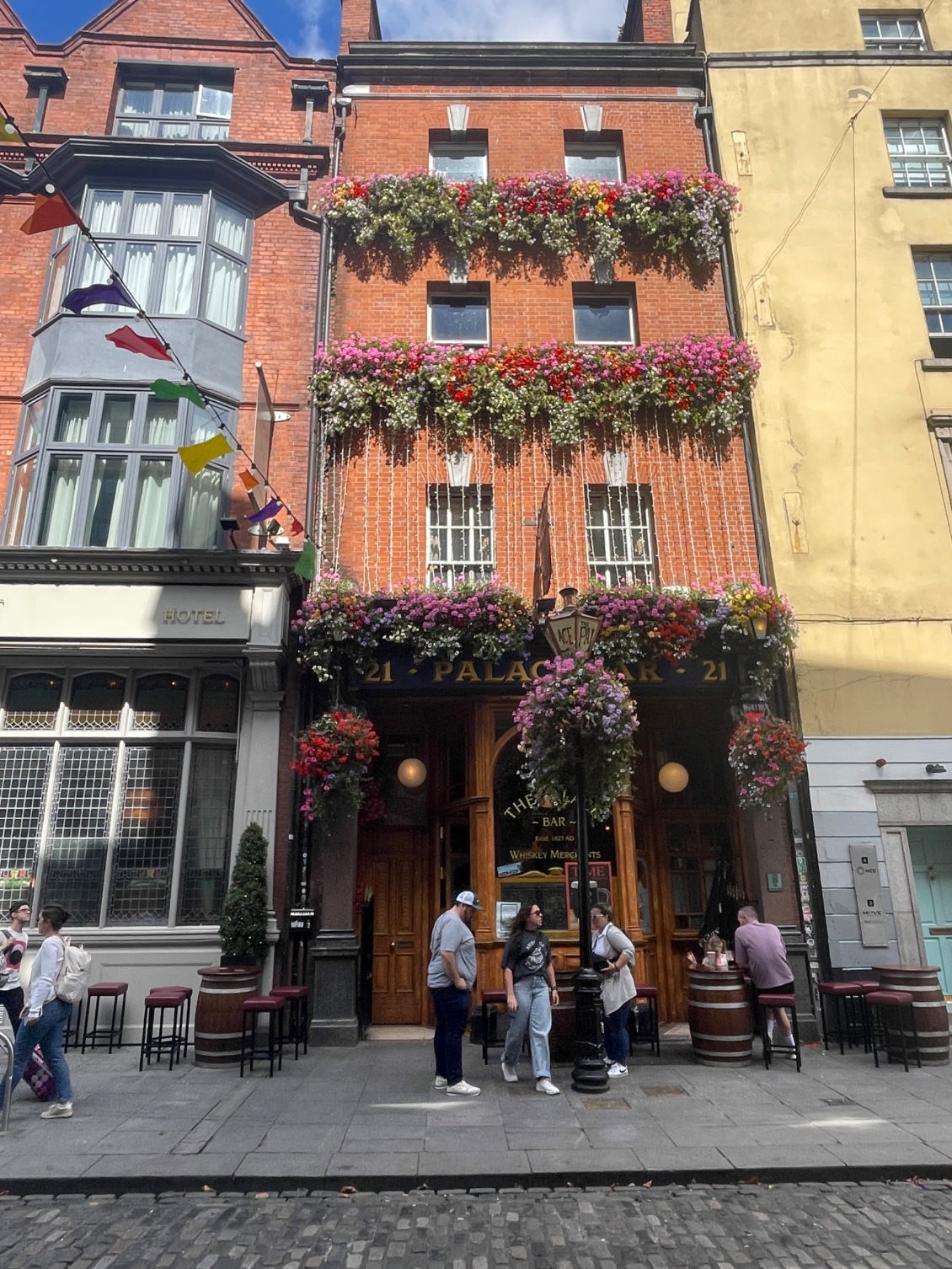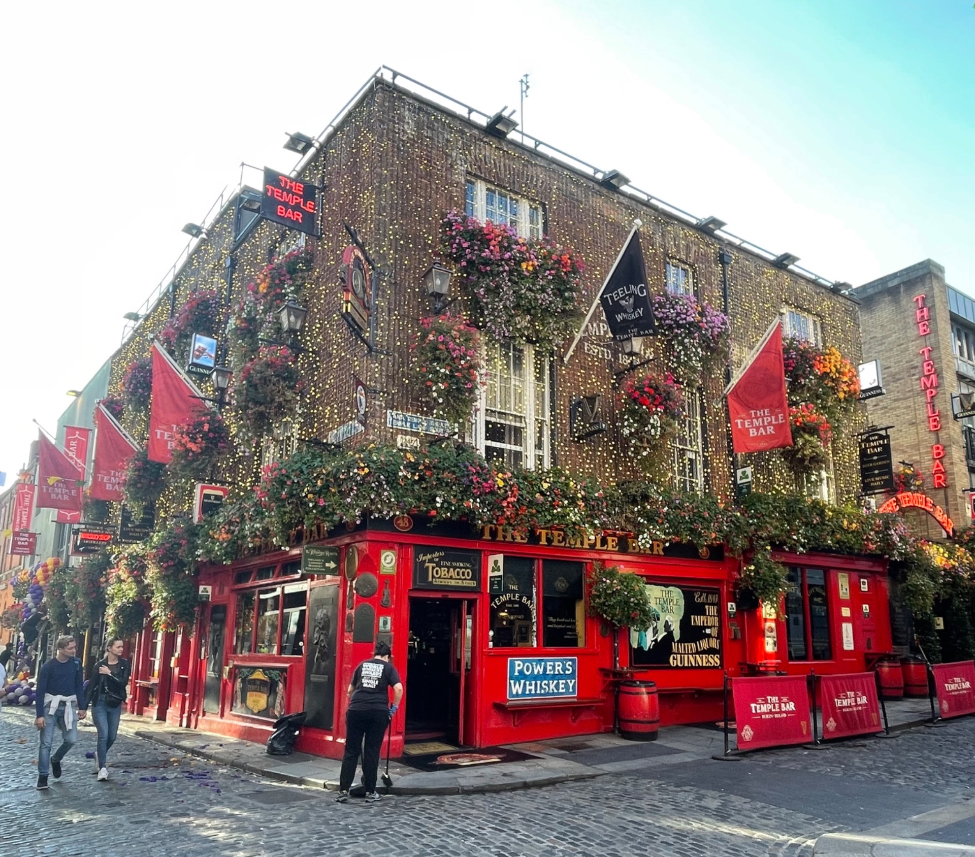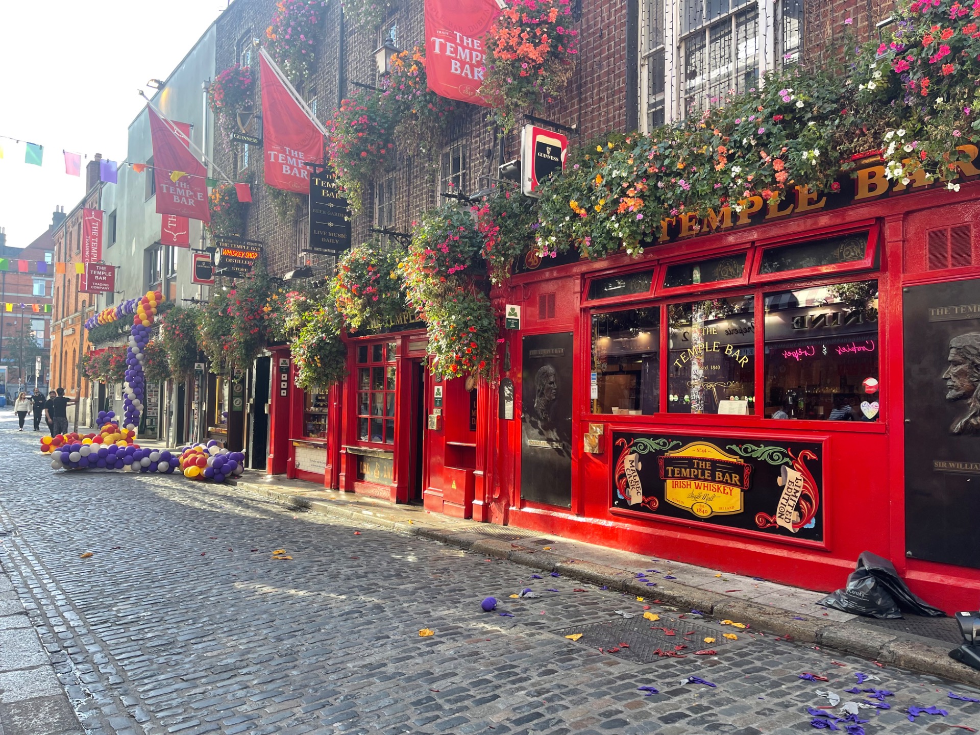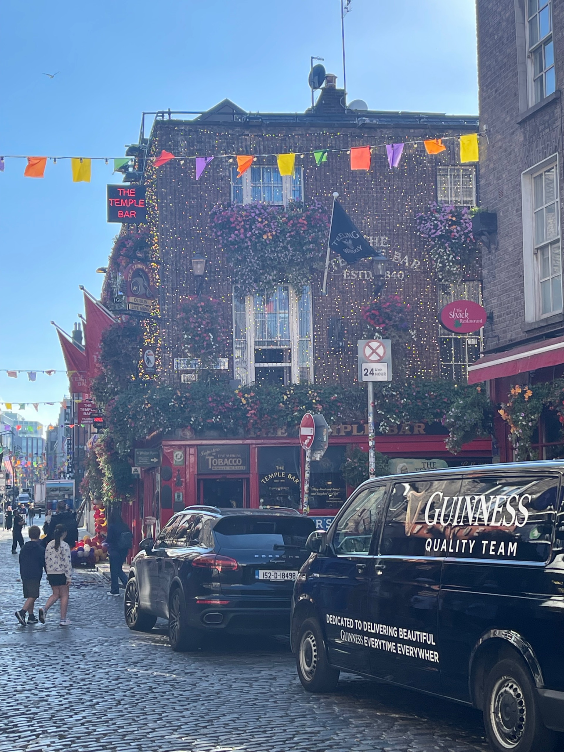 Je repère le centre-ville sur mon traqueur téléphonique. Cela me permet de descendre du bus au quartier Temple Bar. Quel nom étonnant ! Je déambule dans une multitude de rues piétonnes étroites et pavées où foisonnent de charmantes petites boutiques indépendantes, d’intéressantes galeries, de pubs à chaque coin de rue et de restaurants au menu appétissant. Des artistes remplissent déjà l’espace urbain de leur musique. Des groupes de touristes suivent consciencieusement leur guide.