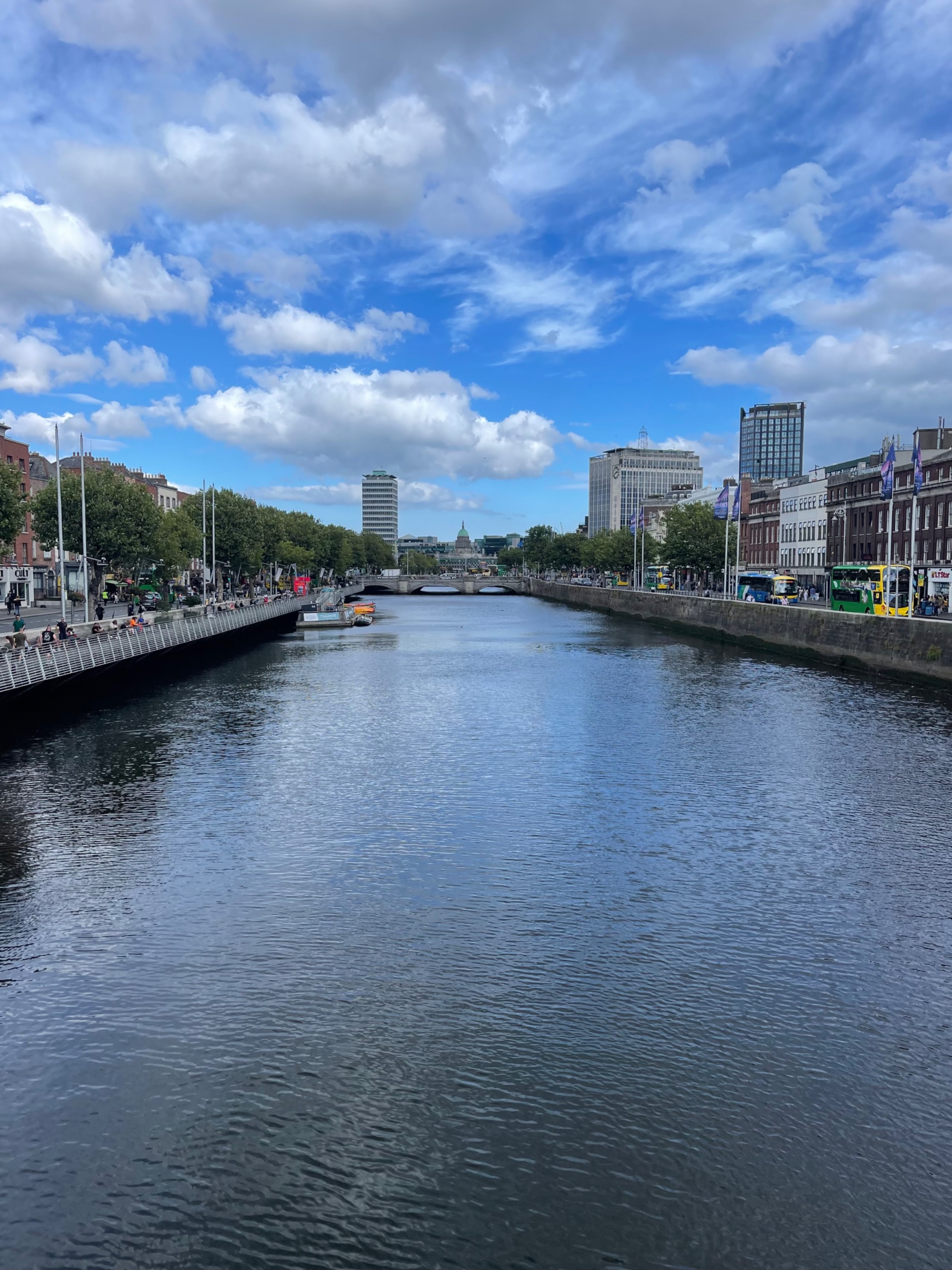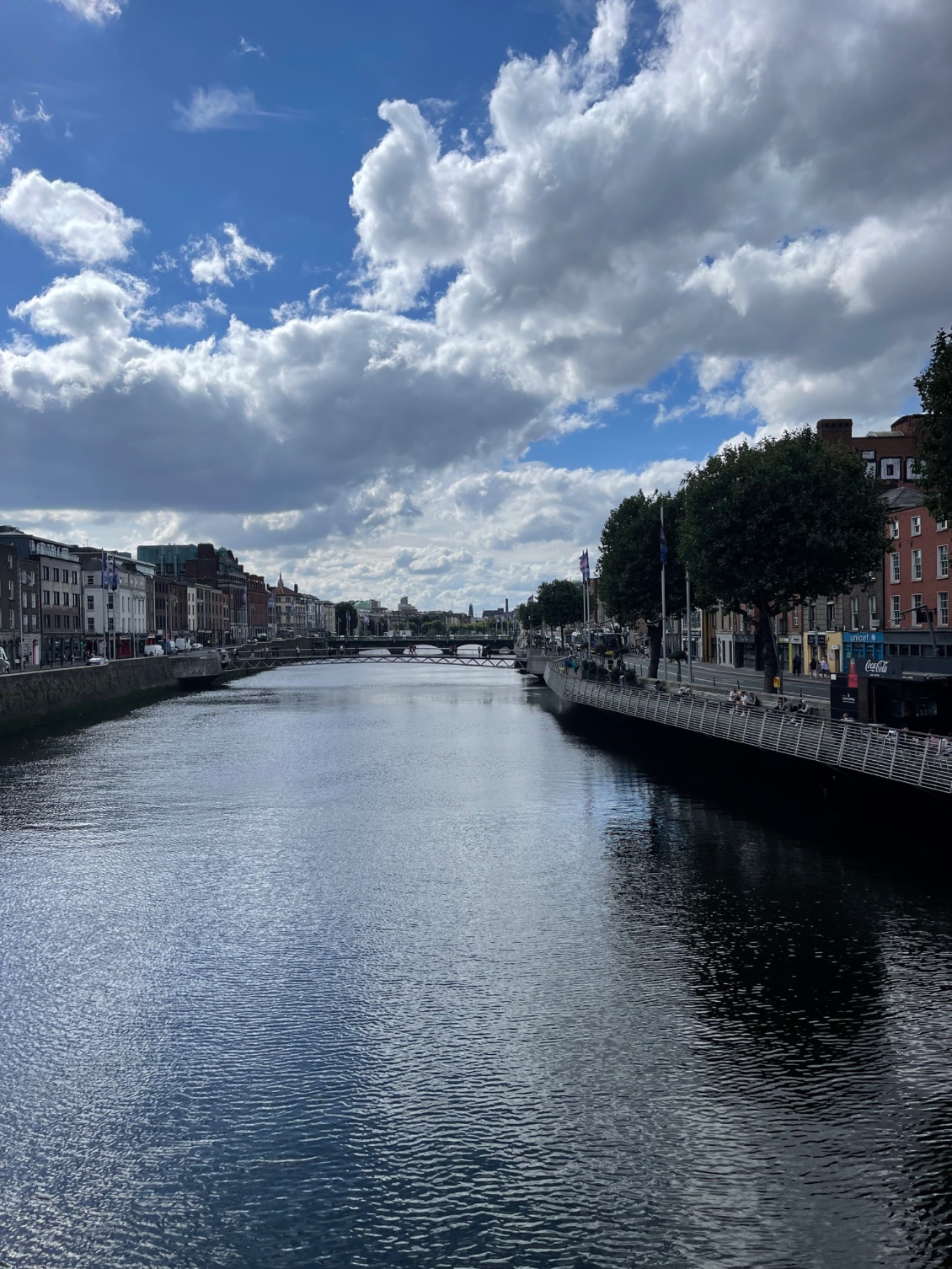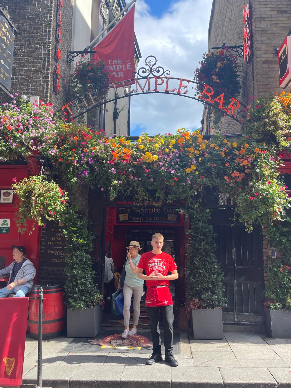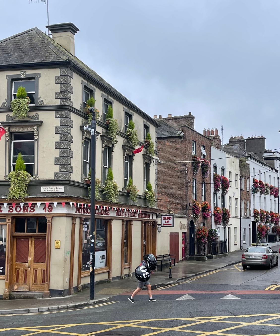 Je repère le centre-ville sur mon traqueur téléphonique. Cela me permet de descendre du bus au quartier Temple Bar. Quel nom étonnant ! Je déambule dans une multitude de rues piétonnes étroites et pavées où foisonnent de charmantes petites boutiques indépendantes, d’intéressantes galeries, de pubs à chaque coin de rue et de restaurants au menu appétissant. Des artistes remplissent déjà l’espace urbain de leur musique. Des groupes de touristes suivent consciencieusement leur guide.