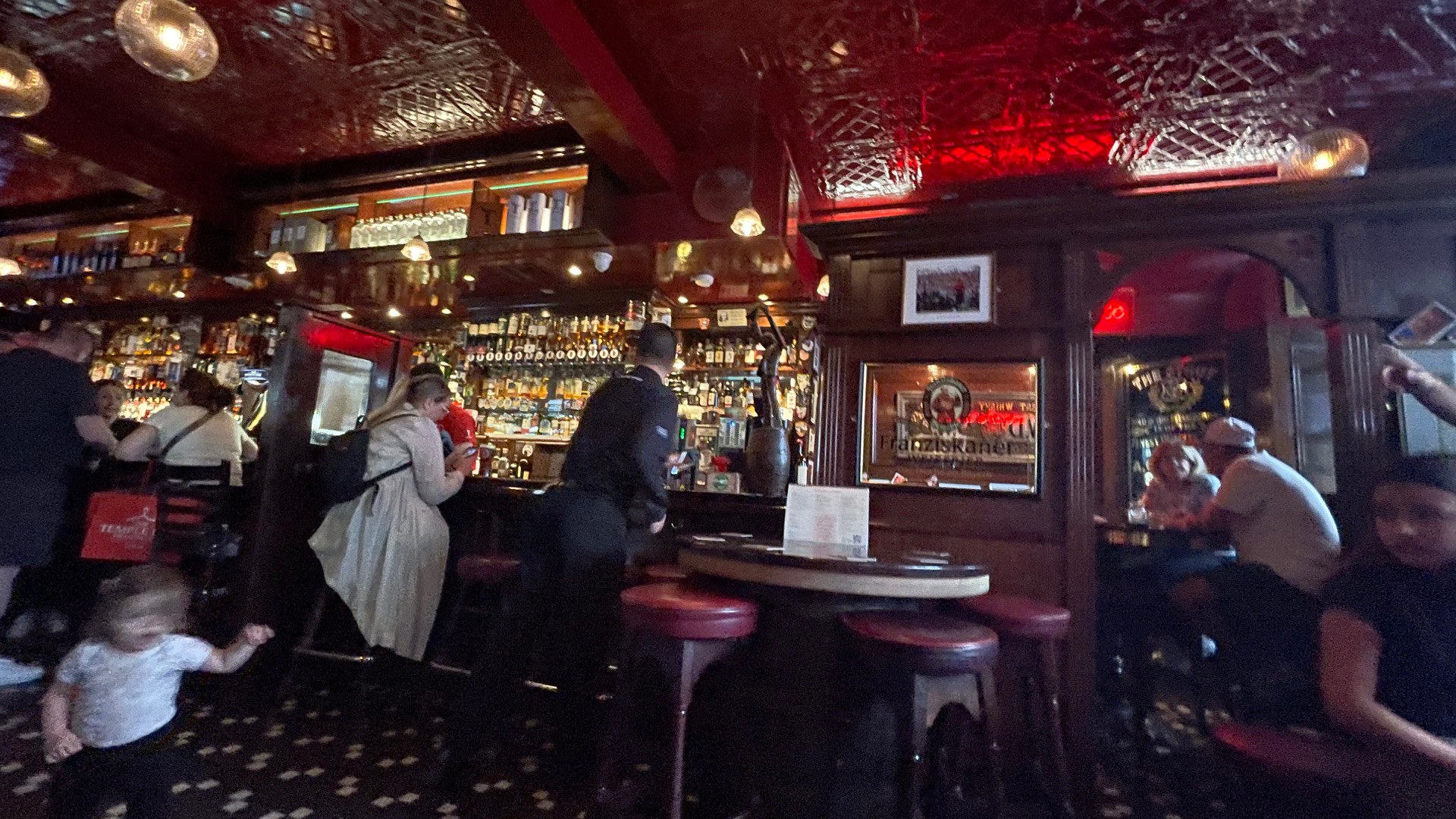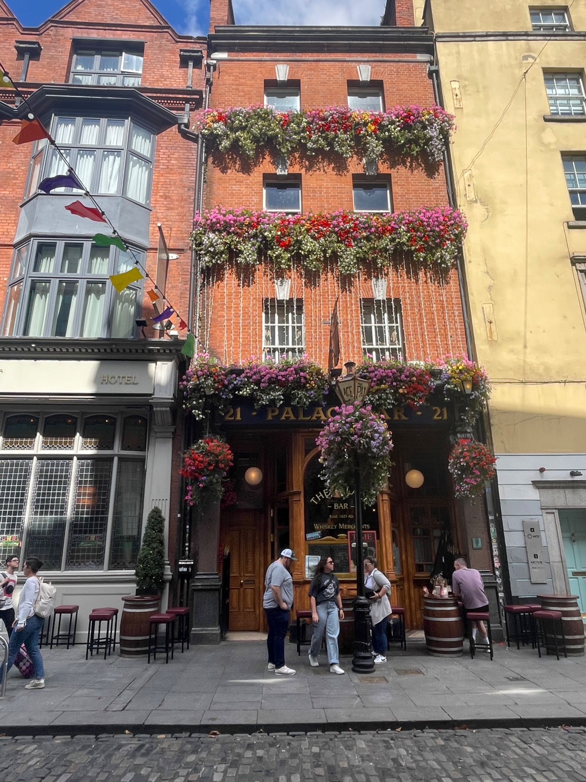 Après toutes ces émotions, je vais justifier l’adage des Dublinois : « Tu liras et tu boiras. » Je me dirige donc vers The Temple Bar dans le quartier du même nom. Il est décrit comme l’un des meilleurs pubs pour écouter de la musique traditionnelle irlandaise. Ce pub date de 1840. La façade du rez-de-chaussée, en bois, est d’un rouge vif. Les étages supérieurs, en briques rougeâtres, sont couverts de fleurs en grappes, de drapeaux rouges à l’enseigne The Temple Bar et de guirlandes tombant à la verticale depuis le toit. Le pub propose trois-cents whiskys différents !