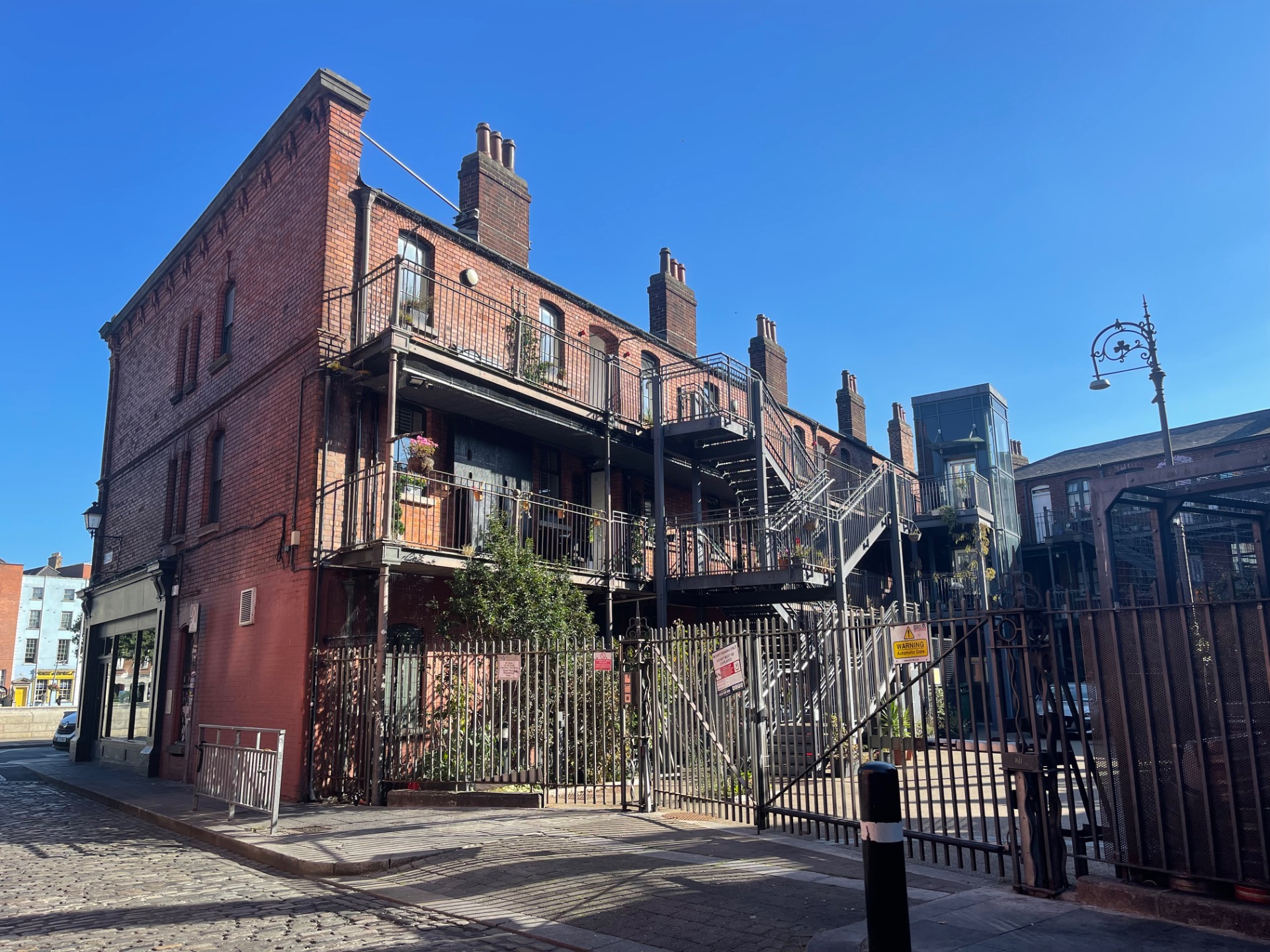 À un carrefour, deux pubs se font face. L’un présente des encadrements de fenêtres vert bouteille qui viennent rehausser le vert printemps de la façade. Des jardinières de fleurs en grappes sont suspendues entre chaque fenêtre du premier étage. L’autre, aux façades blanches, le concurrence avec brio par sa multitude de jardinières aux fleurs en grappes étagées, abondantes, multicolores qui recouvrent les façades du premier étage au rez-de-chaussée. Les deux constructions viennent éblouir le carrefour et le quartier aux briques rouges.