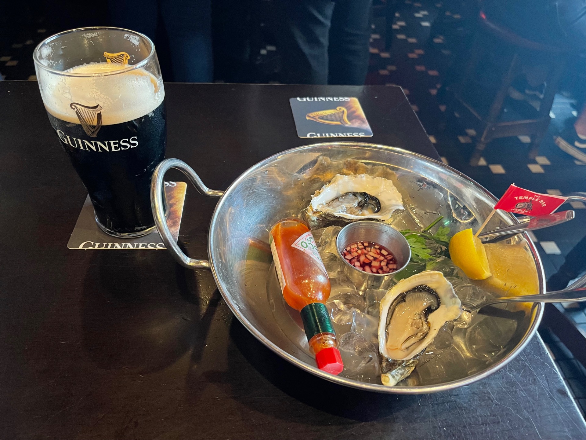 Il me sert quelque temps plus tard un grand plat creux en inox qui contient, à ma grande consternation… deux huîtres ! Elles sont posées sur un lit de glaçons sur lesquels sont déposés un peu de persil, une coupelle de vinaigre à l’échalotte coupée finement et un quartier de citron piqué d’un drapeau avec la mention The Temple Bar. Voilà ce qu’il avait tenté de me dire : « Vous n’avez commandé que deux huîtres ! » Quant à moi, le prix exorbitant ne m’avait pas fait imaginer que l’on ne me servirait que deux huitres. Qu’importe, je peux dire que Guinness et huîtres se marient à merveille !