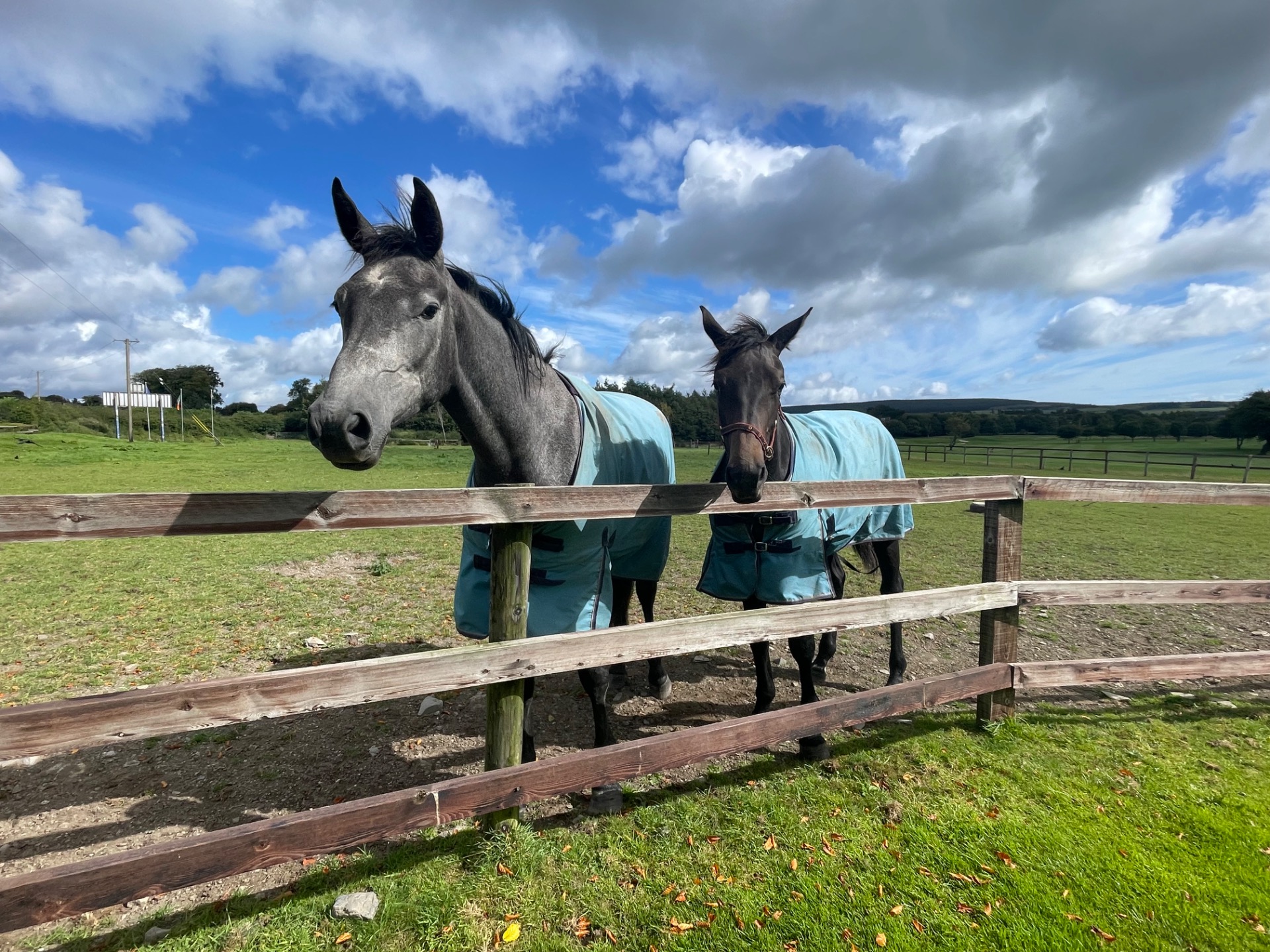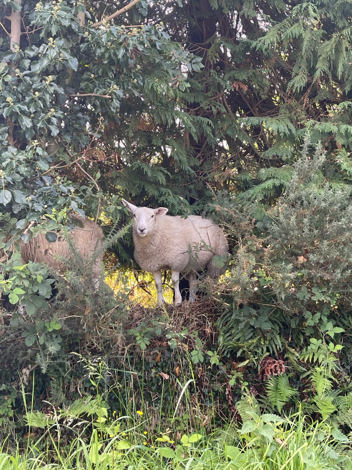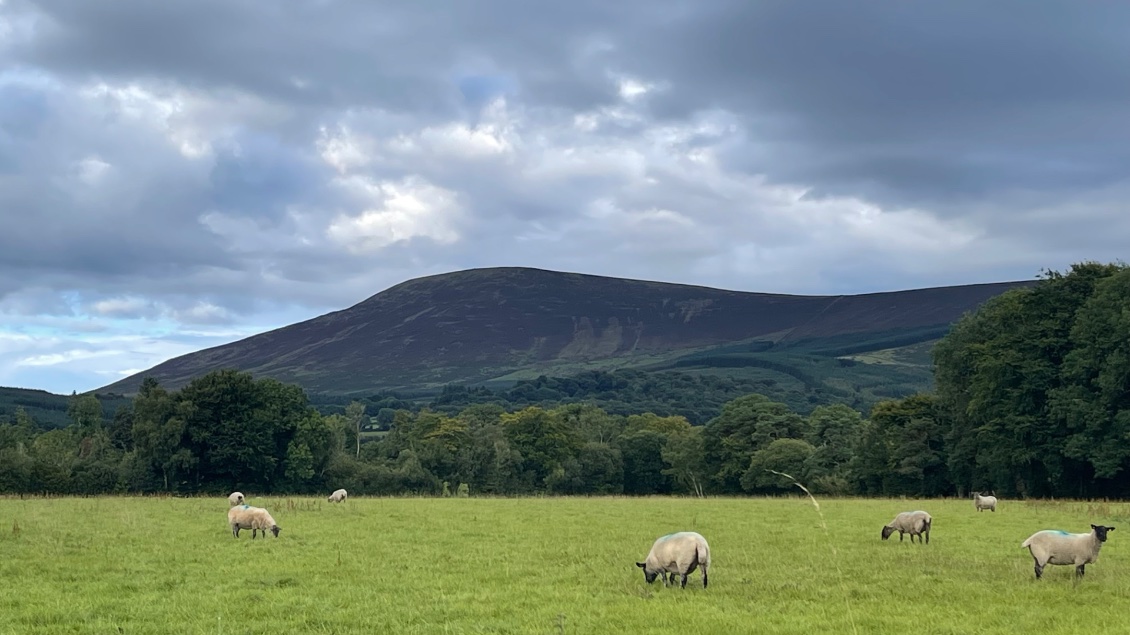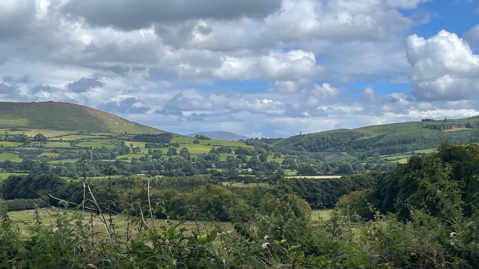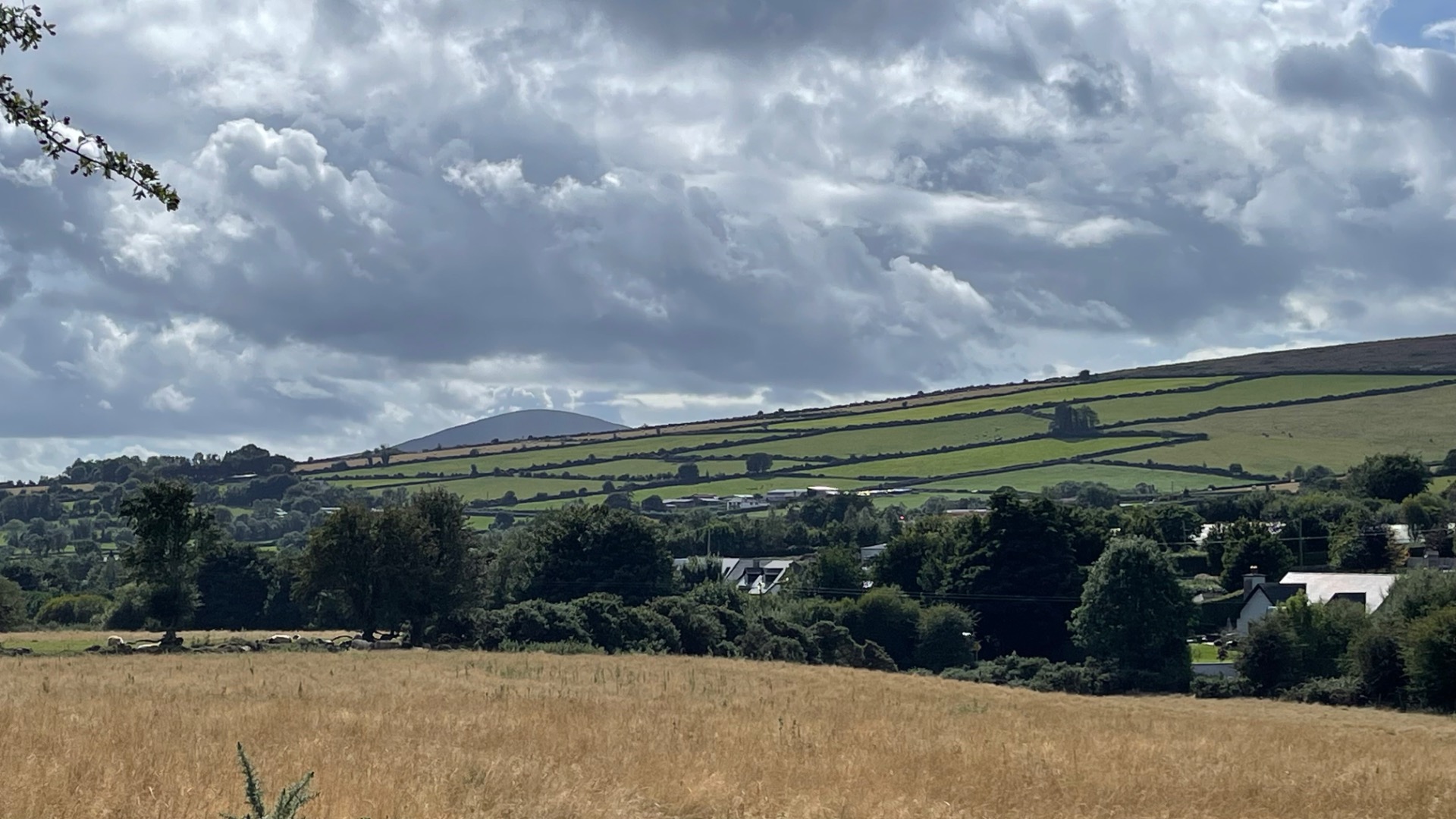 Cette région est à une cinquantaine de kilomètres de la côte. Un coup d’œil sur la carte et je repère une voie verte qui sillonne le littoral. Mais un autre à ma gauche m'indique que j’en suis séparée par les montagnes de Wicklow. Elles constituent la plus vaste région continue de plateaux d’Irlande et culminent à neuf-cent-vingt-cinq mètres. Ah ! Que je suis bien à pédaler sur ma petite route campagnarde sans réellement de dénivelés. Des moutons paissent dans leur champ et sont totalement indifférents à mon passage. Des chevaux, couverts de drôles de manteaux turquoise, me suivent en caracolant derrière leur barrière.