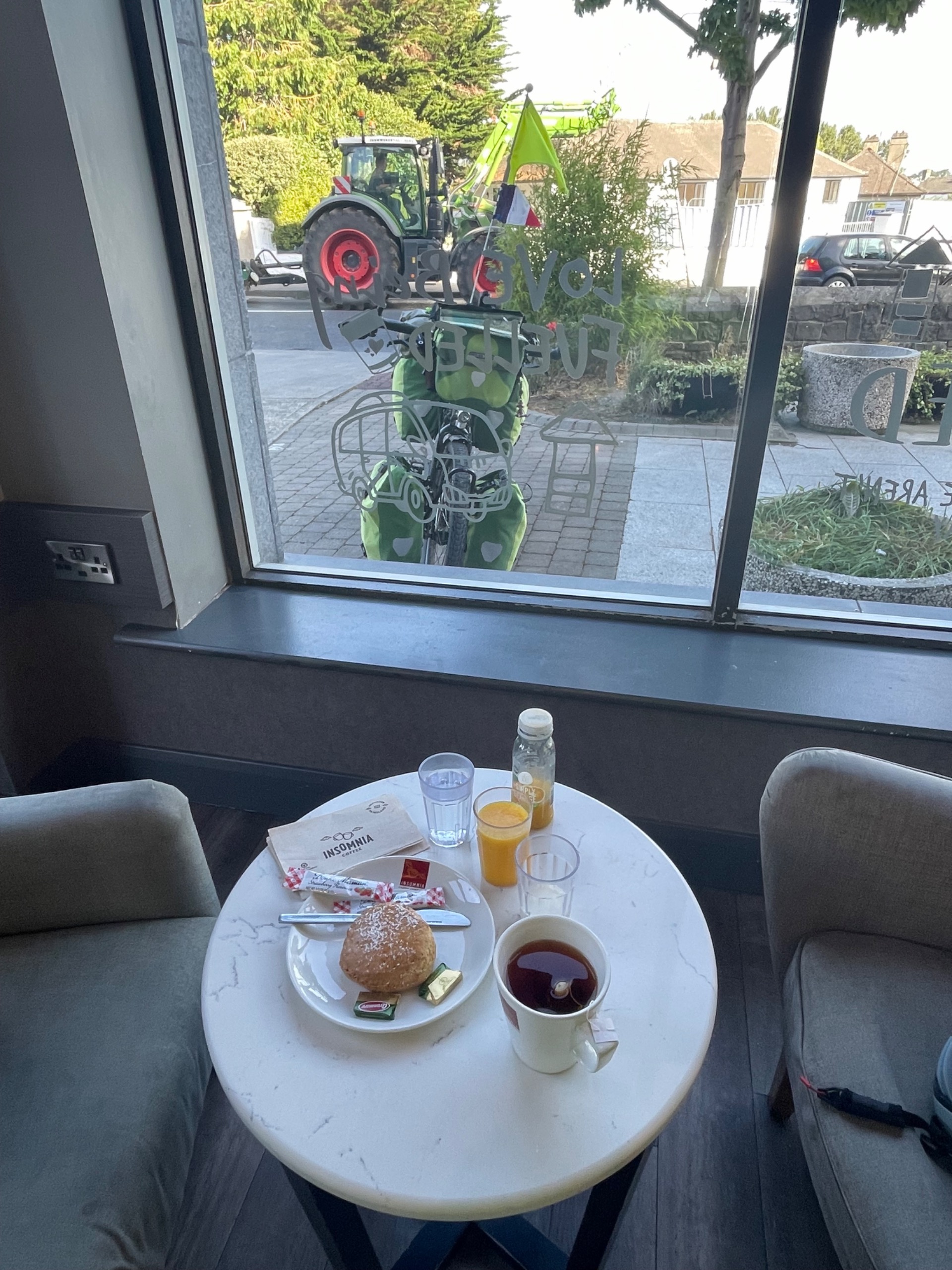 Il est possible d’observer le boulanger, tout de blanc vêtu, œuvrant derrière une baie vitrée. Derrière le comptoir, deux jeunes filles tiennent boutique. Elles ont trouvé une activité qui leur va à merveille. Elles sont alertes, souriantes et vivantes. Elles sont aux anges lorsque je leur demande si je peux les photographier et sortent ensuite sur la terrasse pour admirer ma bicyclette en attente de l’étape qui me conduira à Dublin. Elles tournent autour, s’extasient, me félicitent de visiter leur pays avec un moyen de transport fort insolite à leurs yeux.