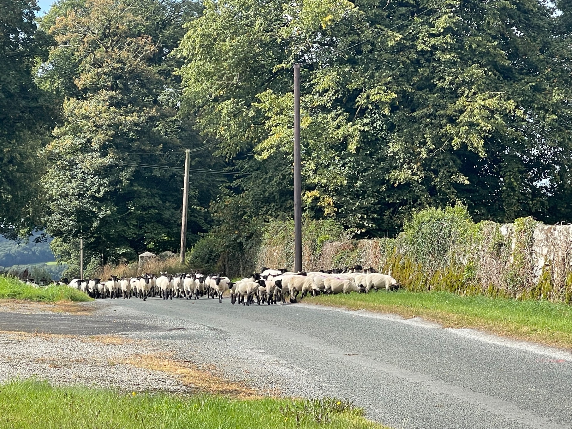 Plus loin, une bergère, arrêtée au bord de la route, me demande gentiment de patienter. J’en comprends rapidement la raison. Peu après, un immense troupeau de moutons se presse sur la route en bêlant. Ils se mettent à courir et c’est à toute vitesse qu’ils bifurquent à gauche dans un chemin. Le fils de la bergère ferme la marche. Il fait en sorte qu’aucun mouton ne s’égare sur la route. Sa mère me remercie chaleureusement d’avoir patienté. Quant à moi, j’ai été ravie d’observer les moutons manifestant leur joie de rentrer à la bergerie située au bout du chemin qu’ils ont pris avec pertes et fracas.