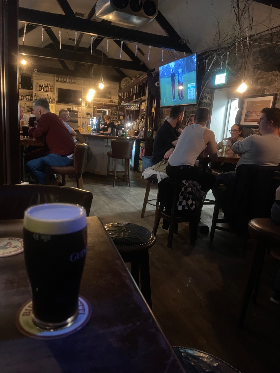Évidemment, je commande une Guinness, cette bière noire coiffée d’une mousse blanche et titrant à 4,2 %. Elle représente la première boisson alcoolisée vendue dans le pays. Je me suis habituée à cette boisson à l’acidité légère et aux arômes de malt et de caramel. Je commande des huîtres car j’apprécie ce fruit de mer. Le serveur commente : « En Irlande, manger des huitres tout en buvant de la Guinness est l’accord parfait. Dans les années 1800, les Irlandais de classe pauvre et moyenne avaient pour habitude de les consommer au pub avec une pinte de Guinness à la main. Le plat est devenu une véritable spécialité. » Et il ajoute quelques mots que je ne comprends pas.